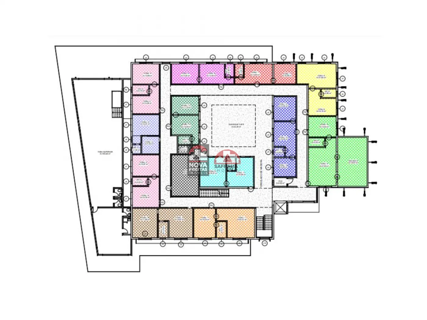 Sala dupla (1º pavimento) com wc privativo distribuído em sala 1 (14,09 m²) + sala 2 (11,76 m²) + wc (2,67 m²), totalizando 28,52 m²