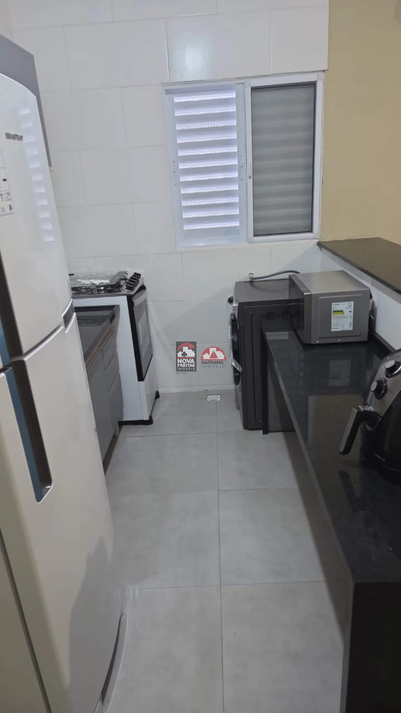 - Cozinha: Equipado com armários, geladeira duplex, fogão, micro-ondas e air fryer