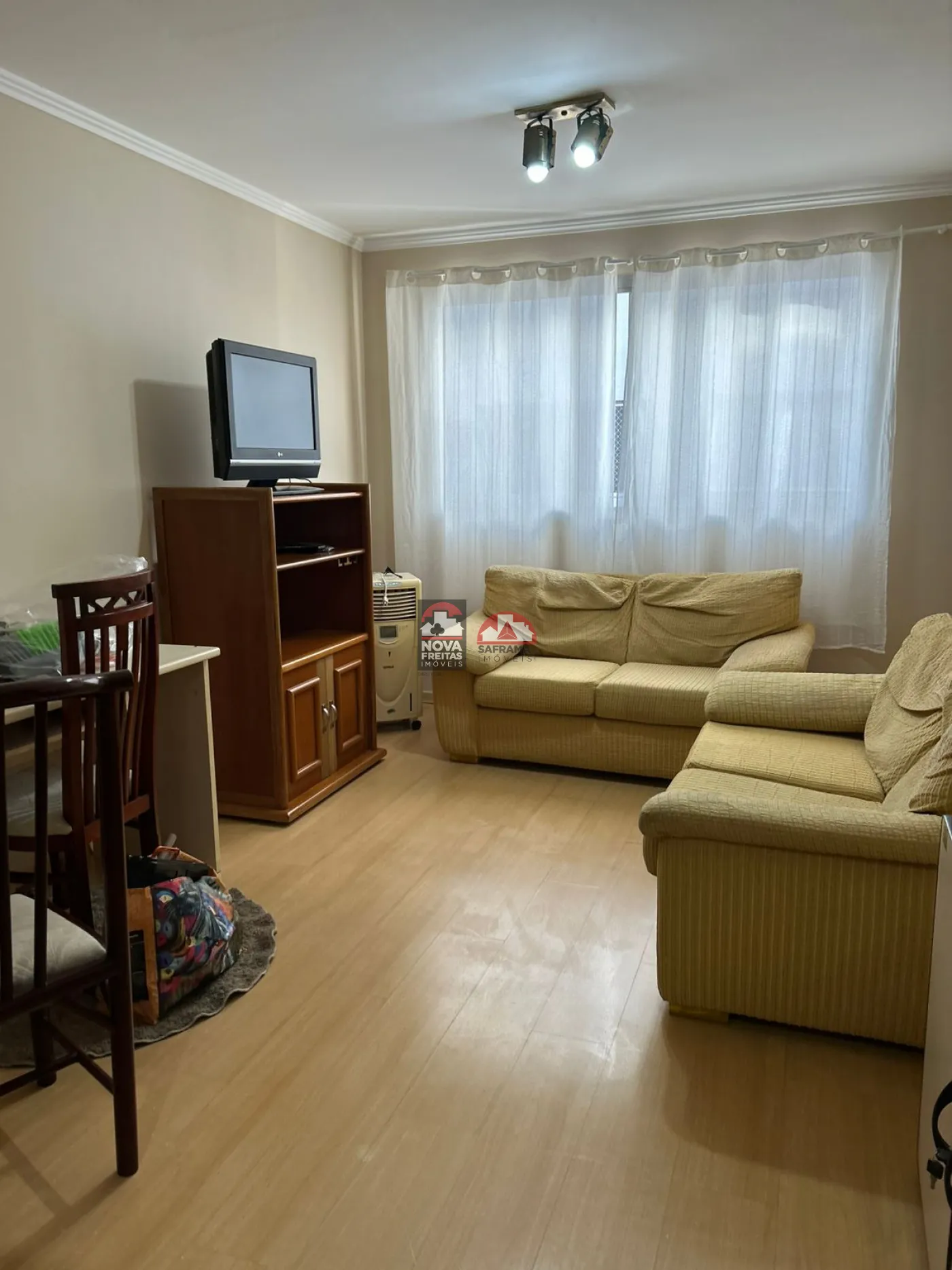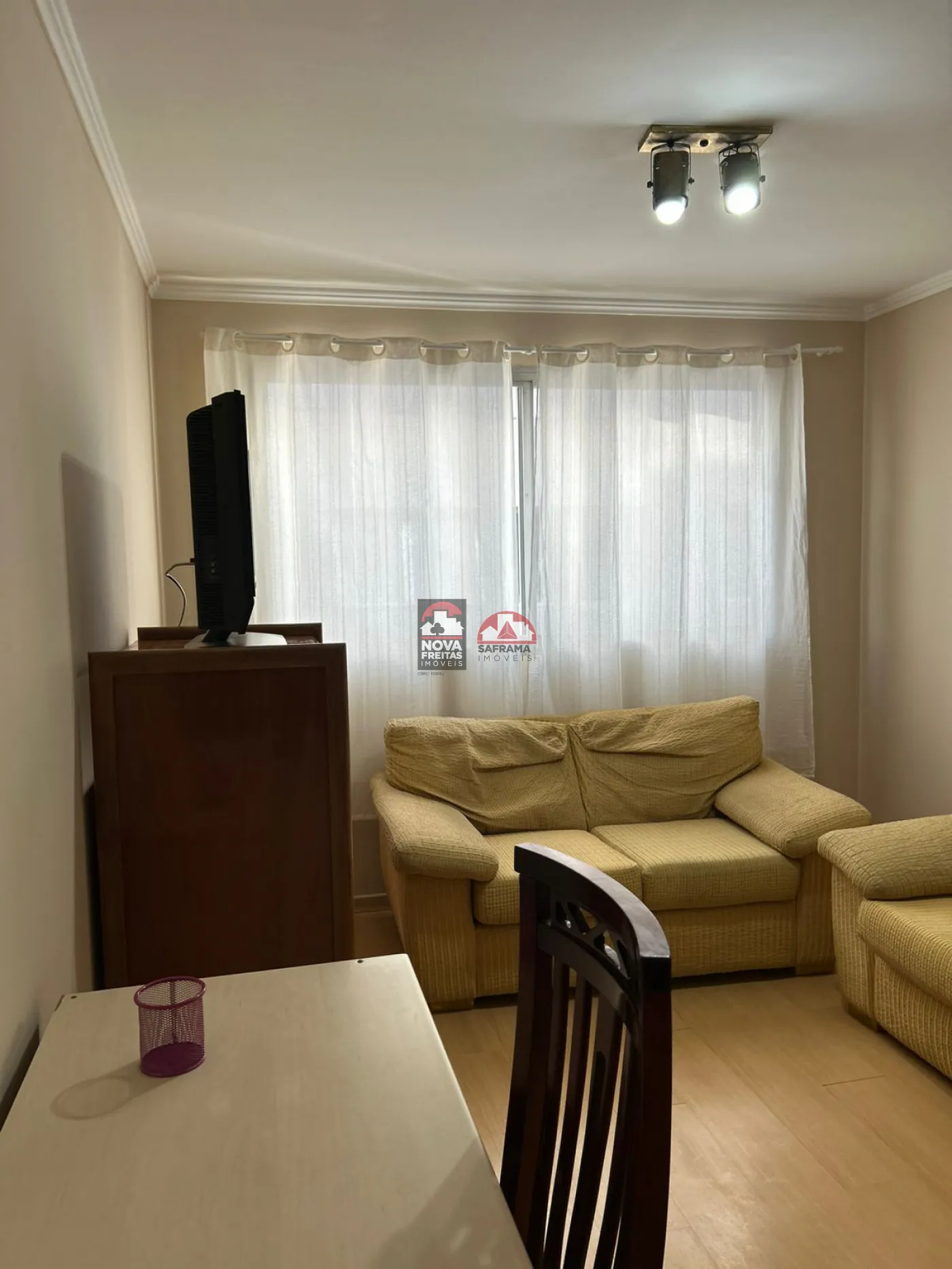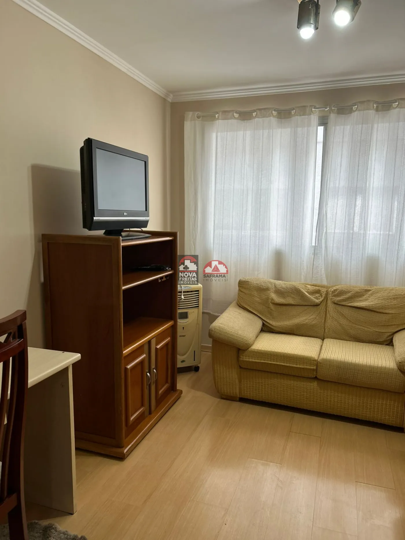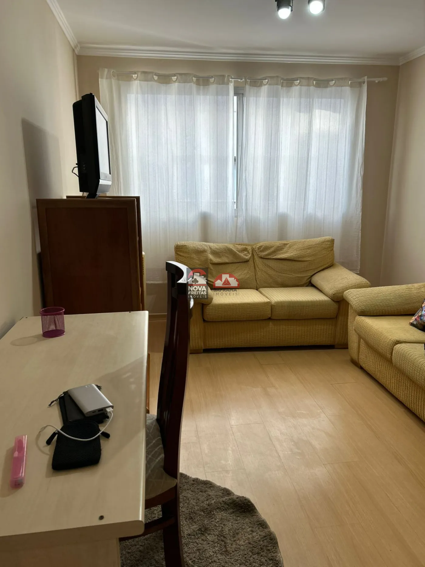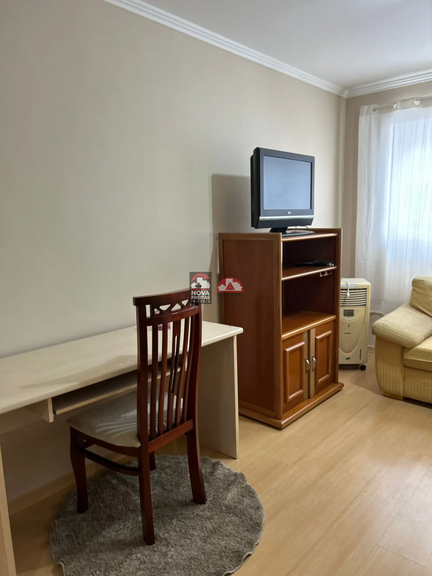 O apartamento está completamente mobiliado, oferecendo mesa com cadeiras, cozinha com armários, sala com dois sofás, rack com TV, refrigerador de ar, fogão, geladeira, micro-ondas, filtro de água e escrivaninha com prateleiras. O banheiro conta com box e gabinetes, e a área de serviço está equipada com máquina de lavar. O quarto dispõe de 2 camas box e um guarda-roupa. Venha conferir!