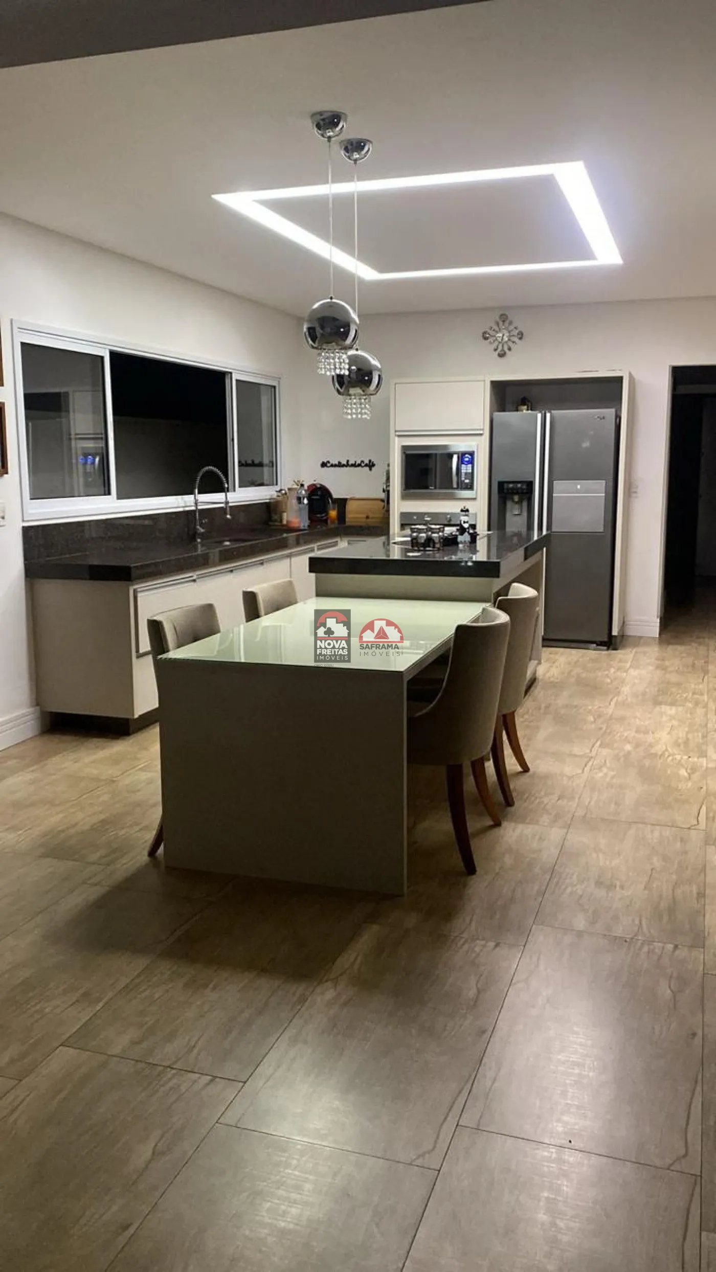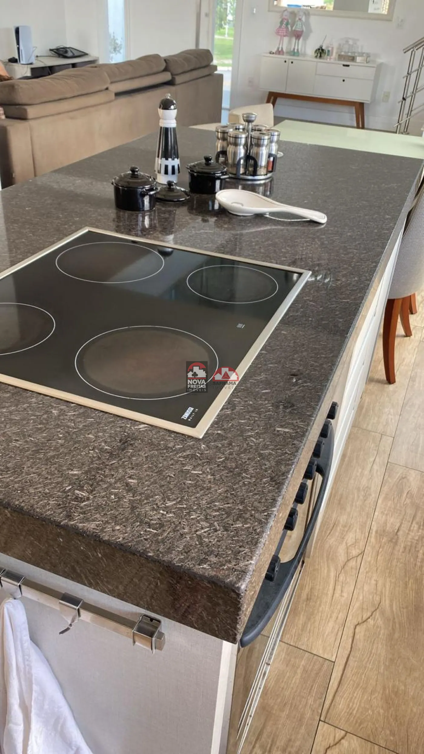 - Cozinha moderna com ilha central, totalmente integrada ao ambiente social.