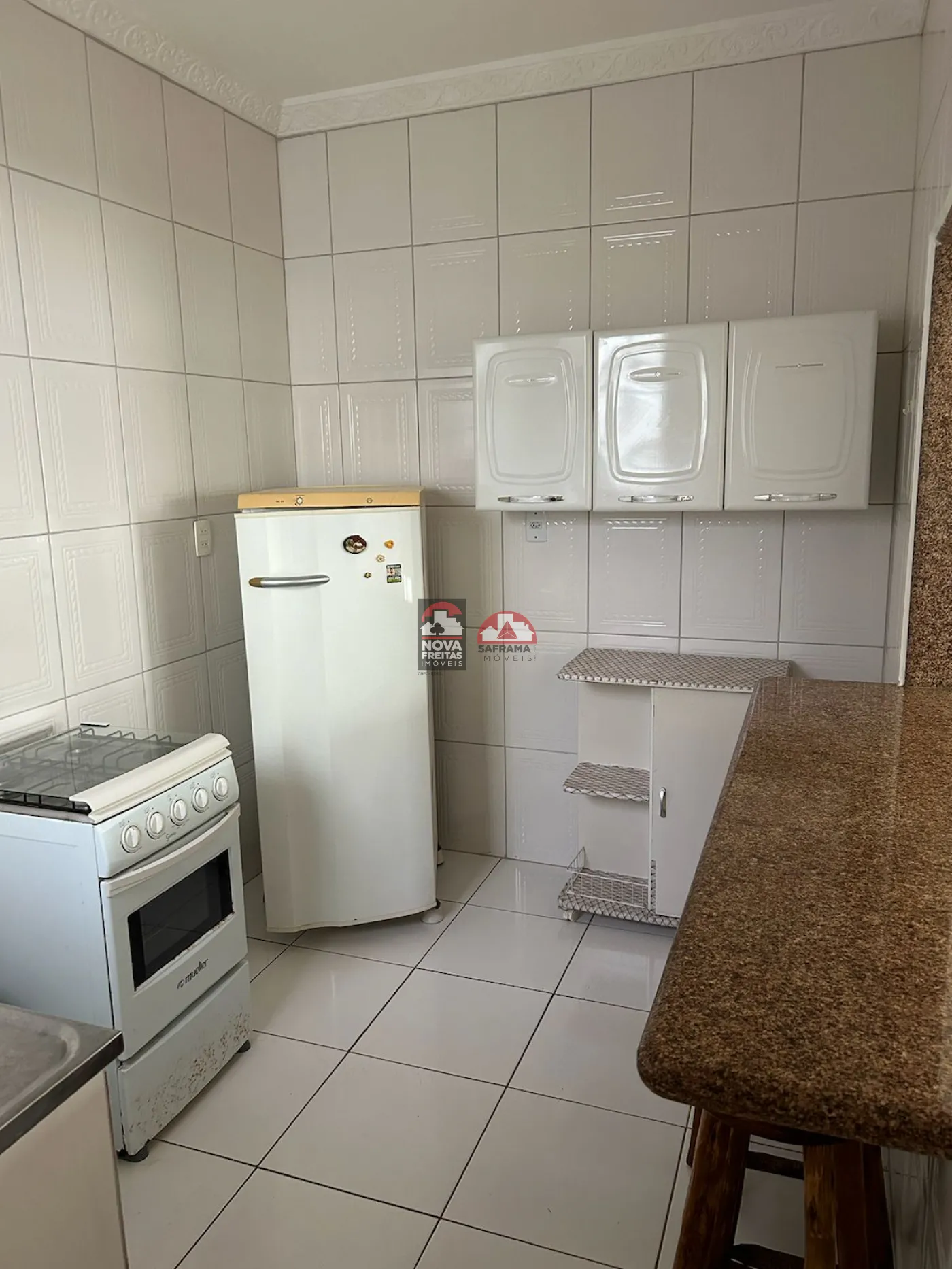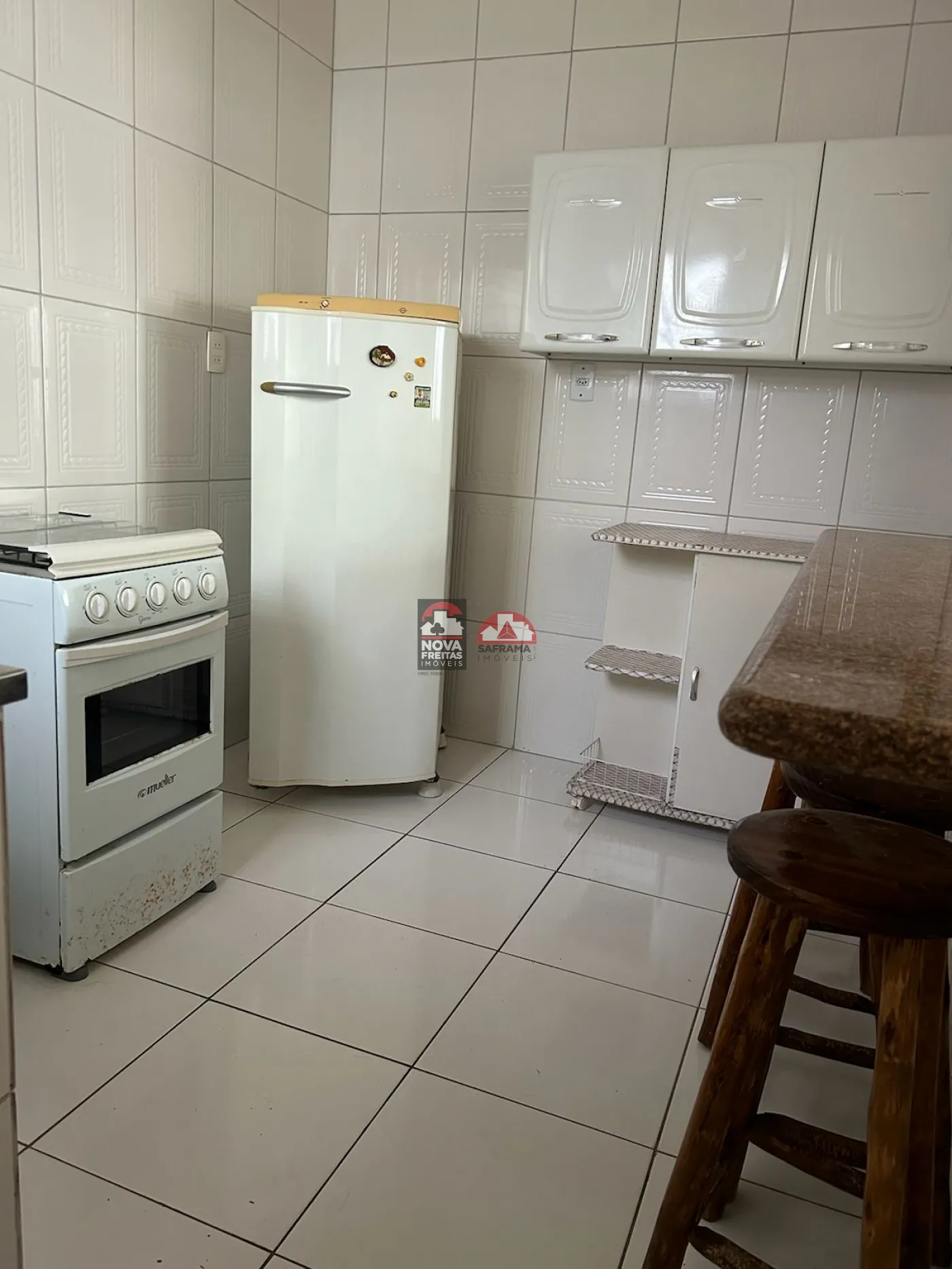 - 1 Cozinha funcional contendo geladeira, fogão, armários e uma bancada com banquetas com acesso a sala de jantar;