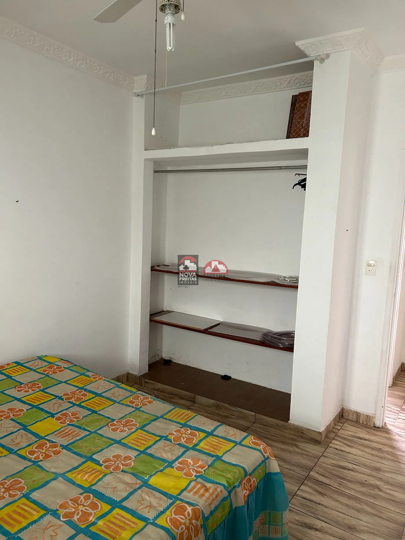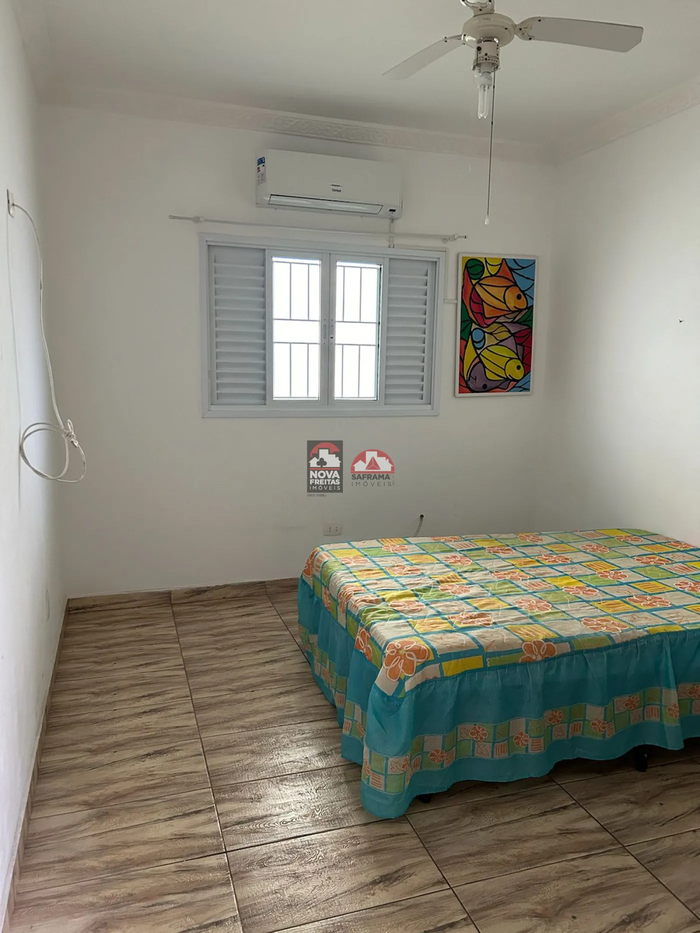 - 1 Dormitório amplo e arejado com armário embutido, cama, ventilador de teto e ar condicionado split;