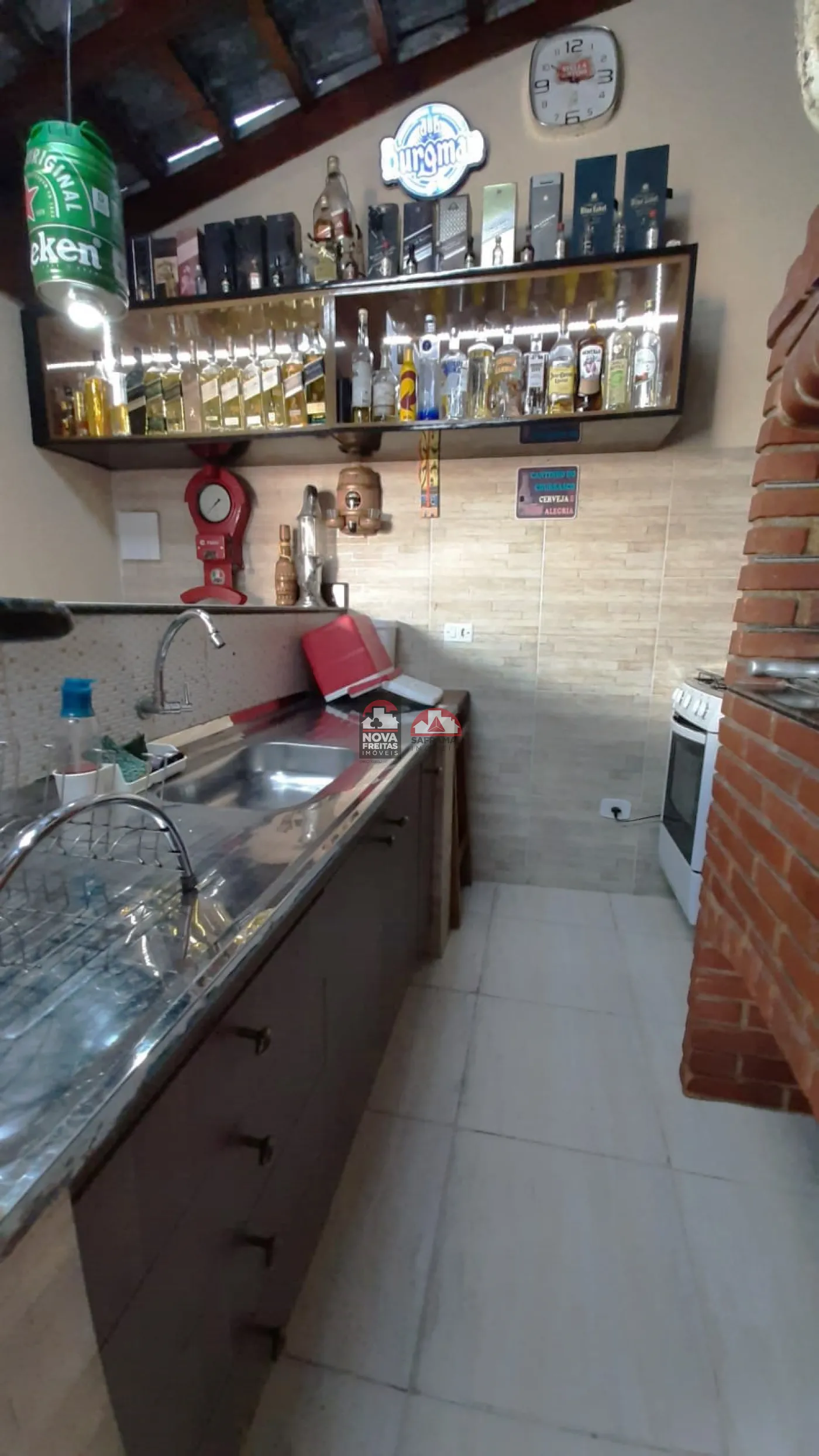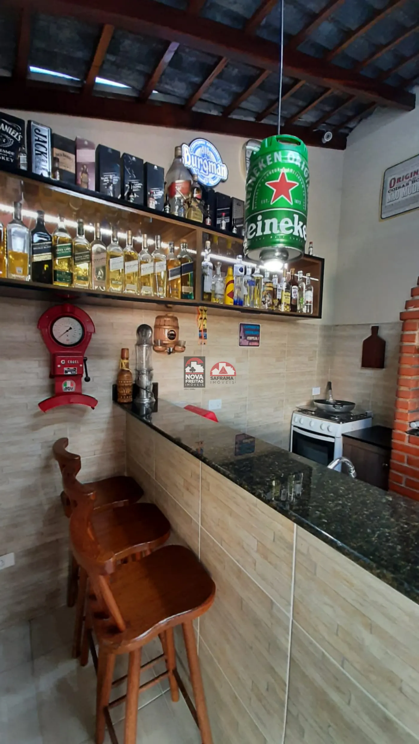 A área gourmet é um destaque à parte, equipada com móveis planejados, bar, churrasqueira e fogão a lenha, além de um banheiro social e um quarto/despensa para maior conveniência. A piscina, com capacidade para 18 mil litros e elevação de 80 cm do nível do solo, é ideal para aproveitar os dias mais quentes com total privacidade.