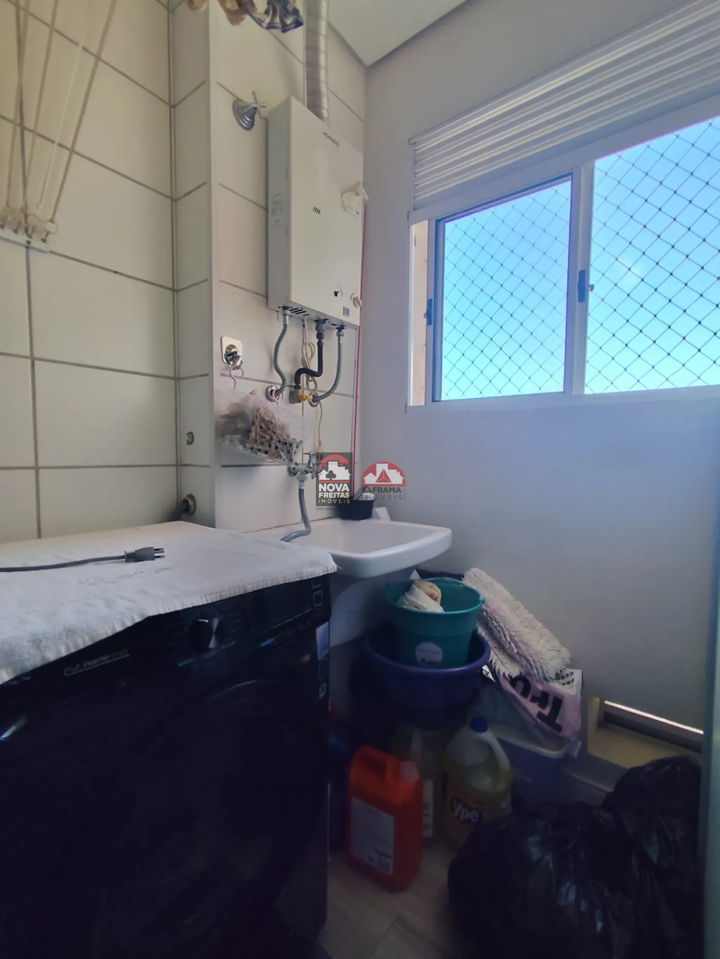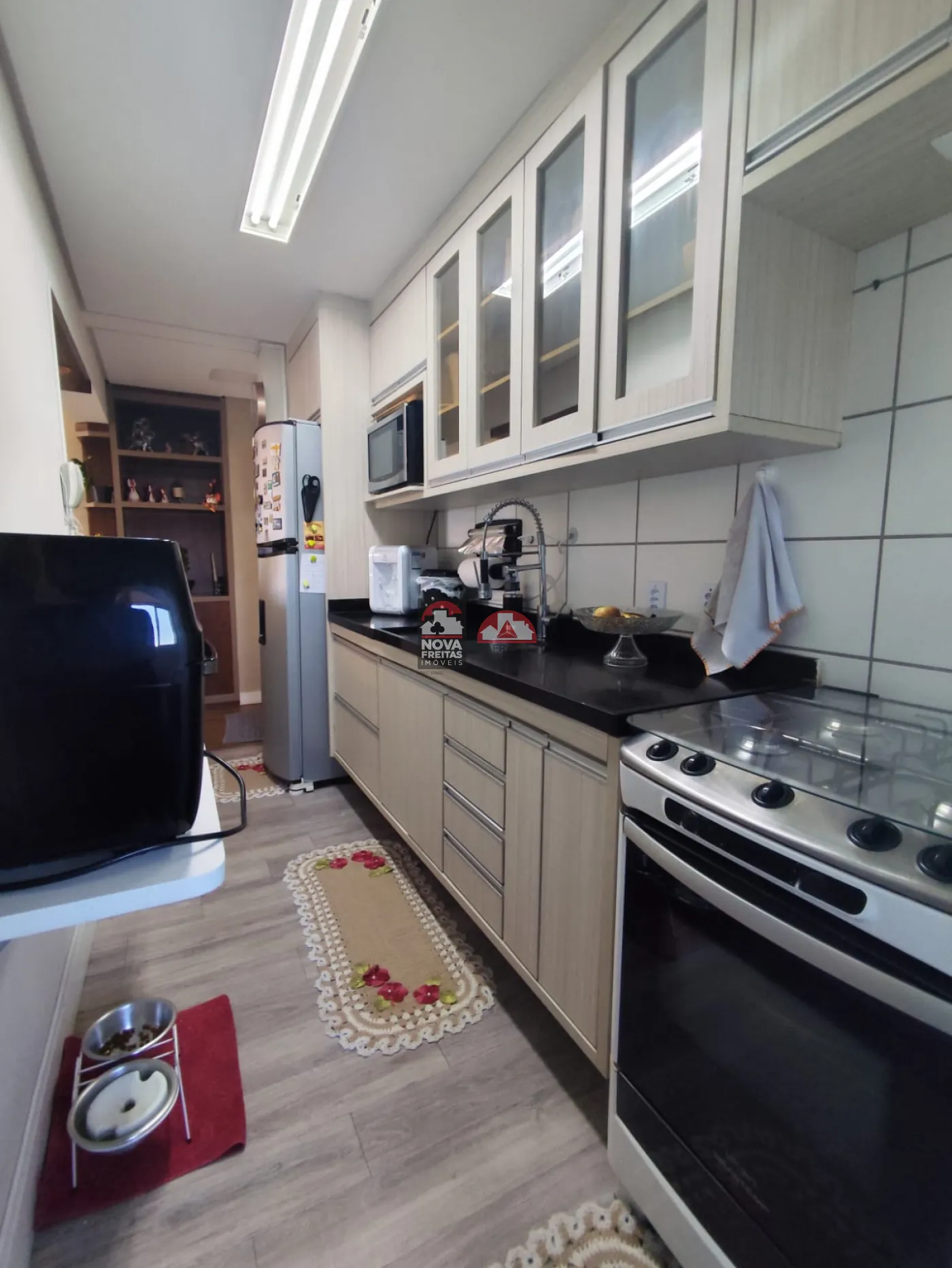 A cozinha possui armários planejados, oferecendo praticidade, e a área de serviço é independente.