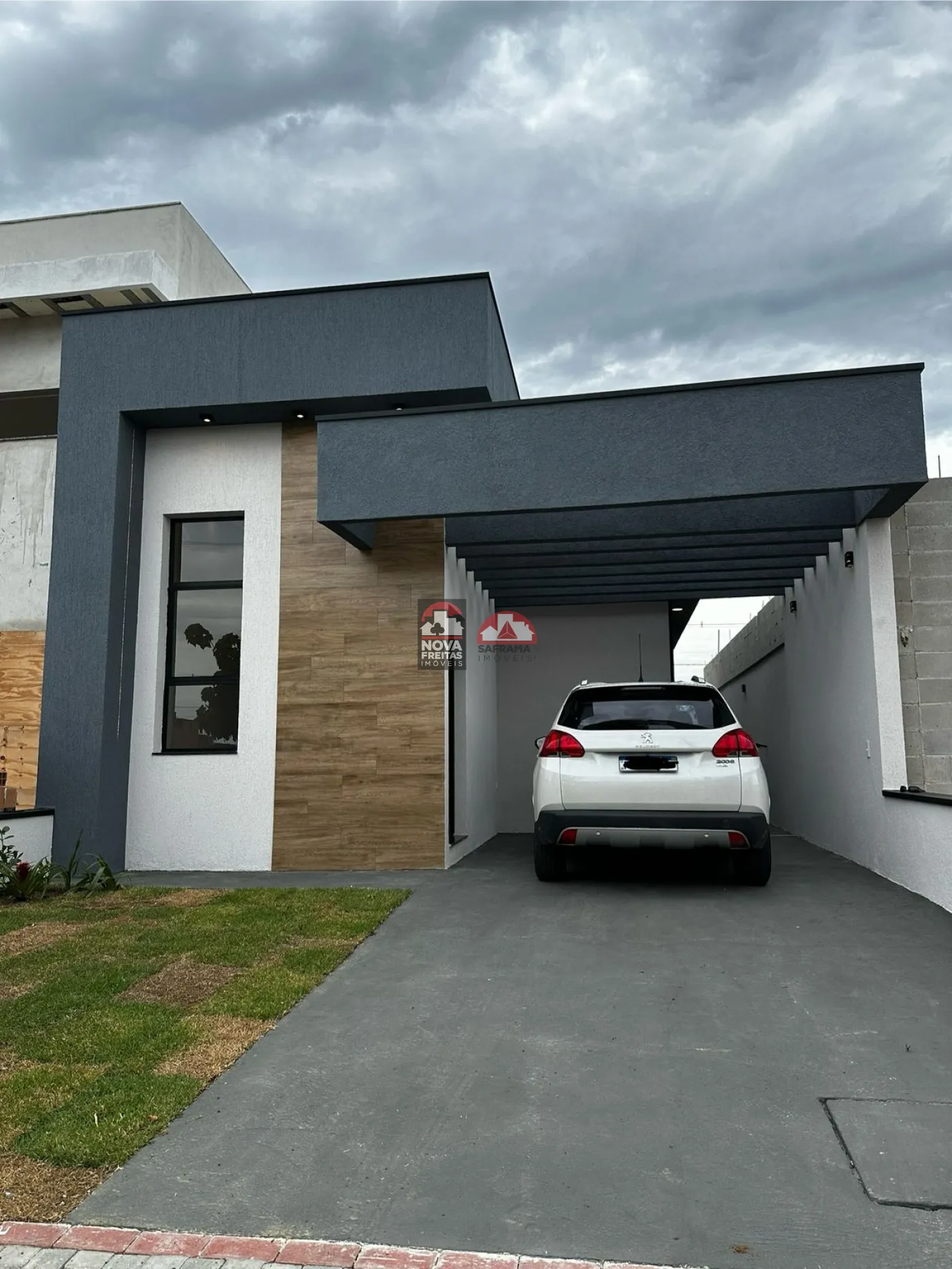 Quintal espaçoso e garagem coberta com pergolado.