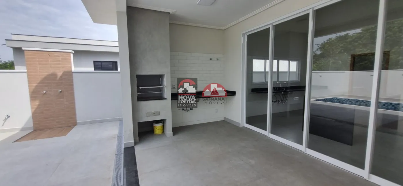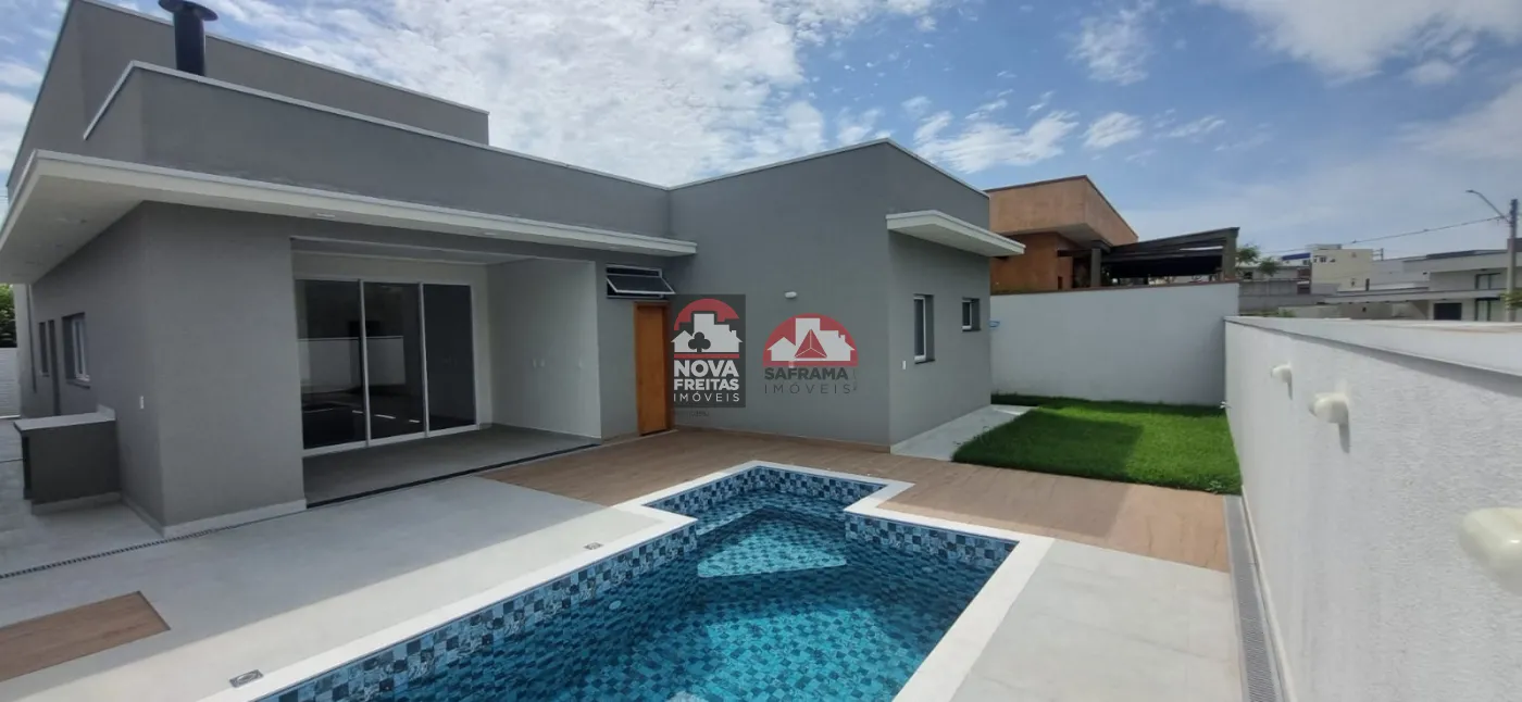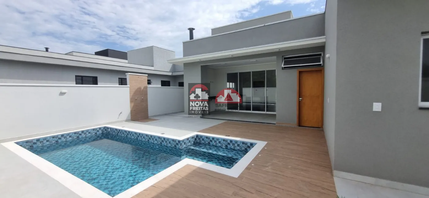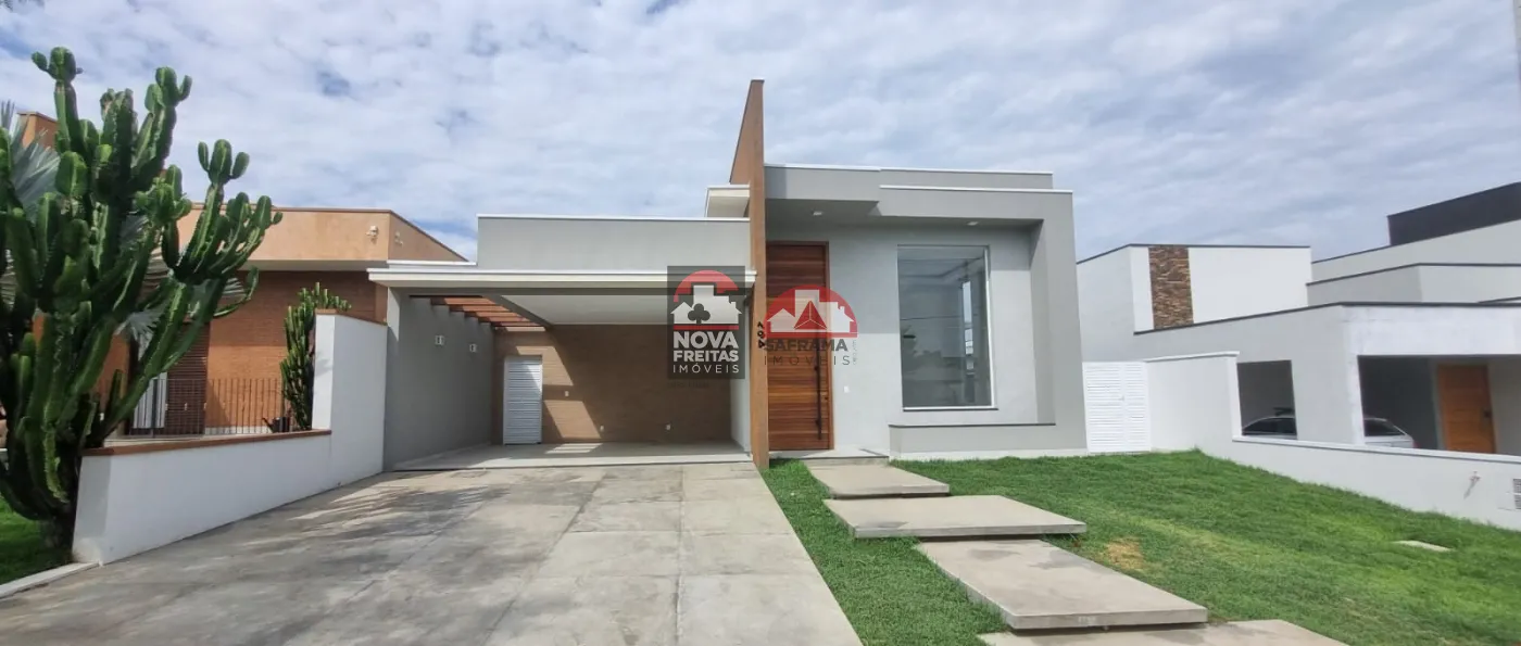 Casa nova térrea em condomínio próxima ao Shopping, com 1 vaga de garagem coberta, 1 sala de estar, sala de jantar, área de serviço, cozinha e 1 área gourmet, 3 suítes sendo 1 com closet, 1 escritório com lavabo, 1 banheiro social, lavabo externo, quintal com piscina.