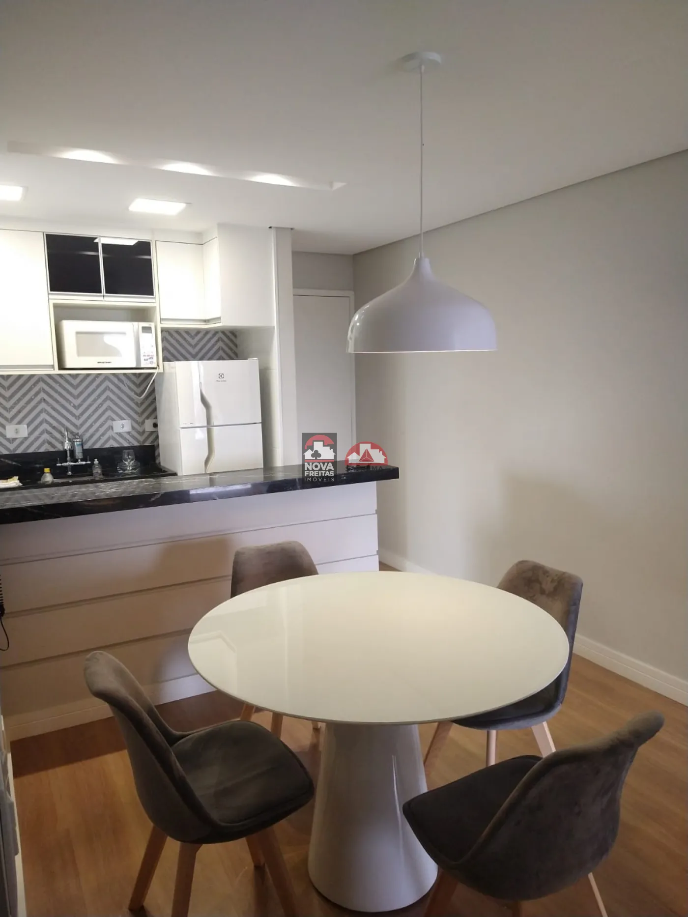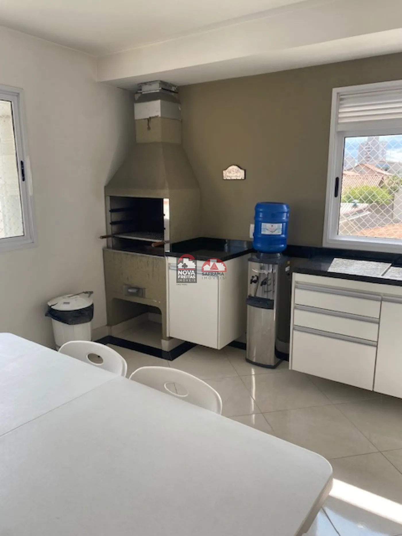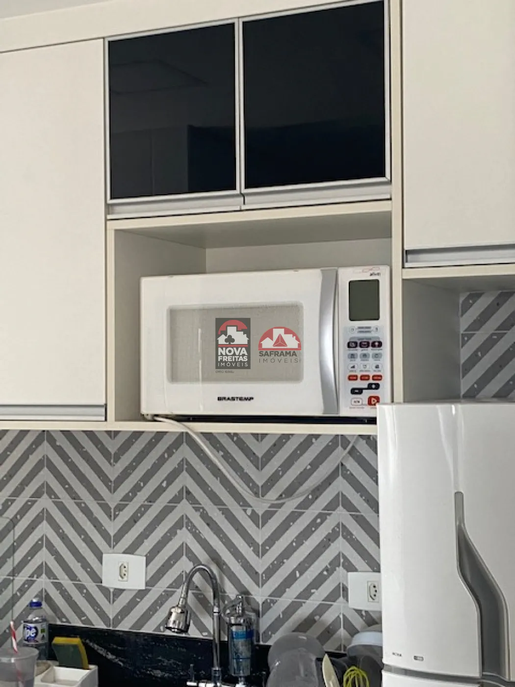 - Cozinha arejada, com fogão, geladeira, microondas, facilitando o preparo das refeições e máquina de lavar roupas, favorecendo a limpeza e organização.