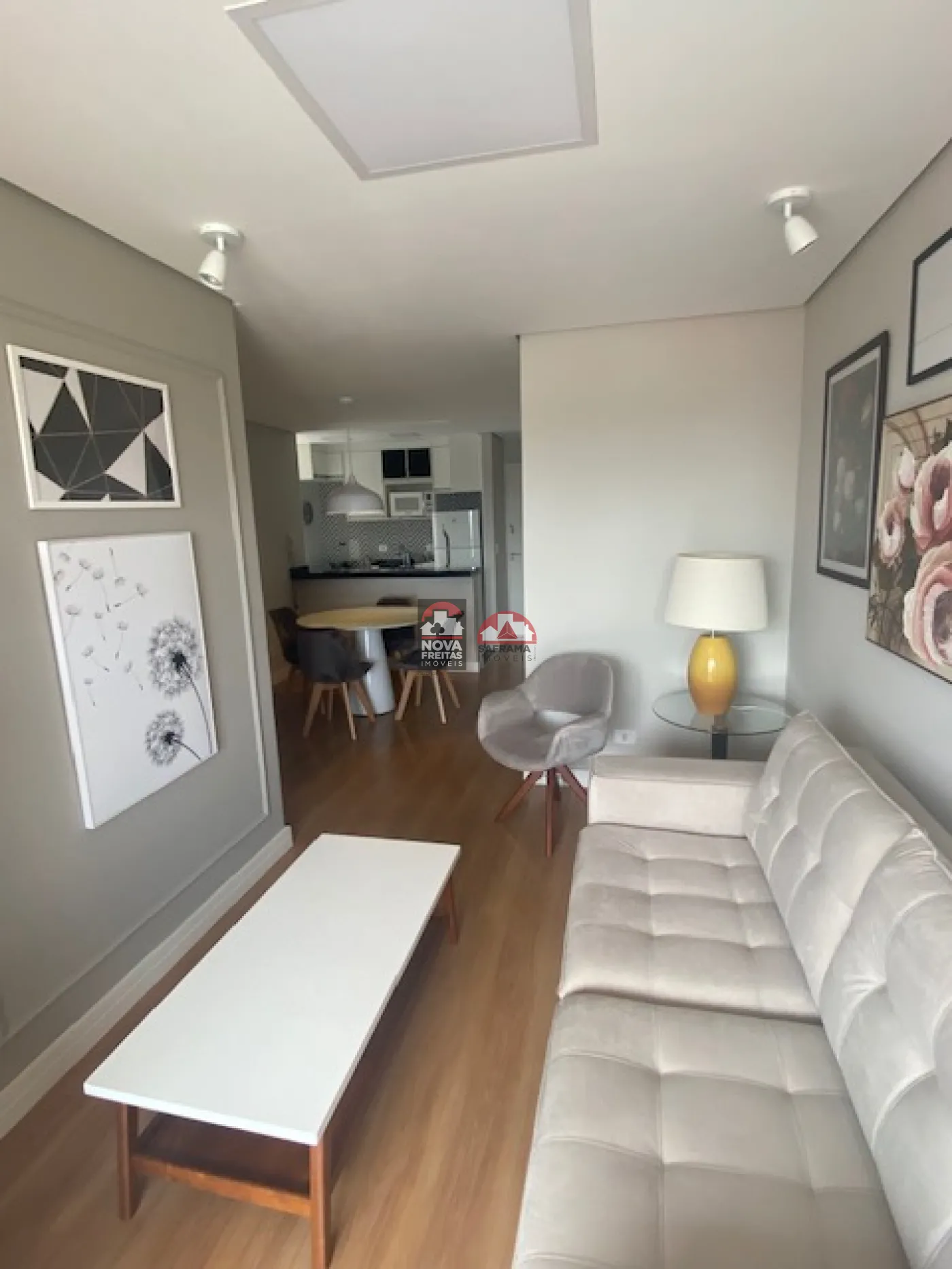Sala de estar espaçosa, com mesa de jantar e sofá, perfeita para receber visitas e desfrutar de momentos de lazer em família.