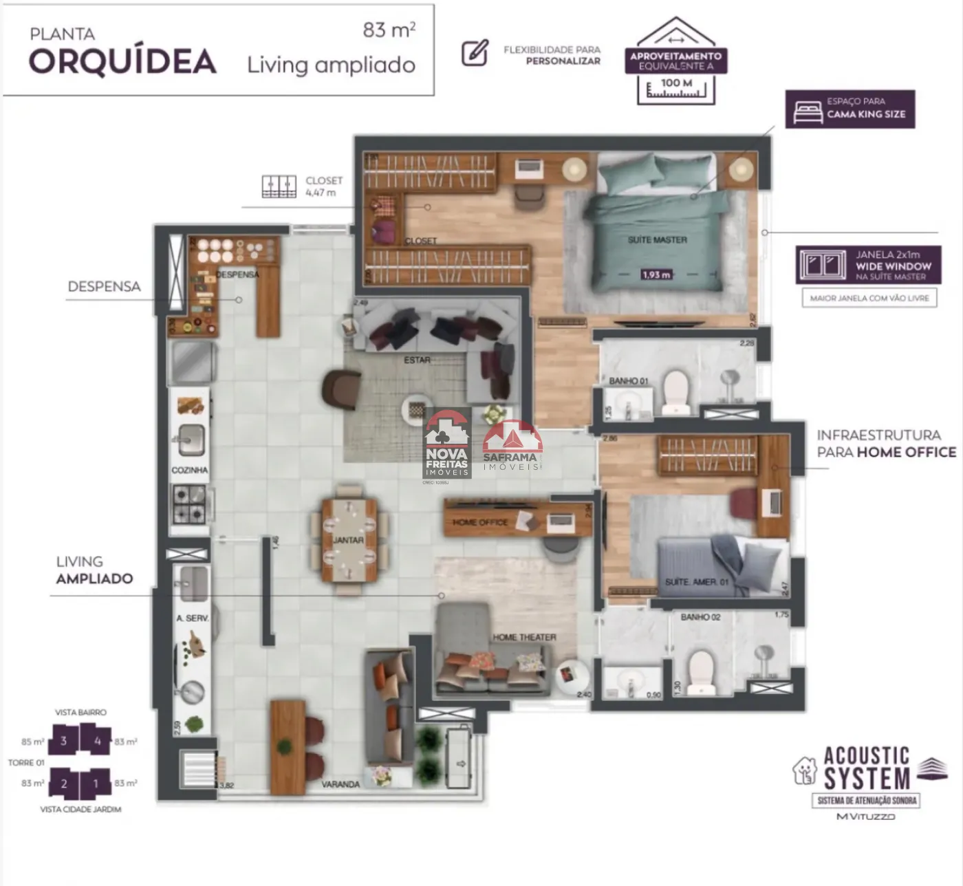 Empreendimento de duas torres, com 25 pavimentos sendo 04 apartamentos por andar na torre 01 e 08 unidades por andar na torre 02, totalizando 300 apartamentos, Possui quatro tipos de plantas a sua escolha: planta Violeta com 54m², planta Lírio com 66m² ou 68m², planta Jasmin com 76m² e planta Orquídea com 83m².