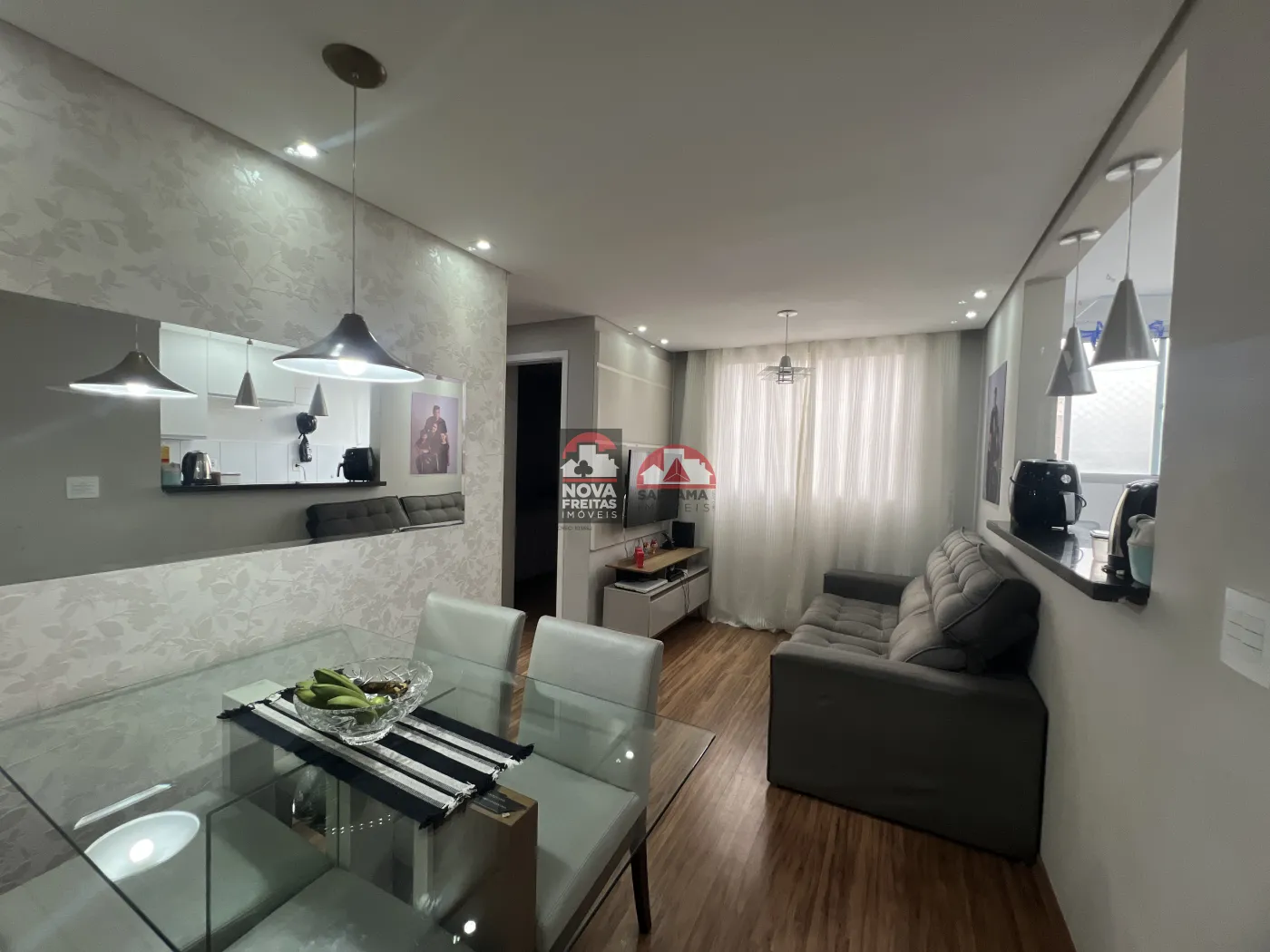 Apartamento de 43 m² com 2 quartos, sala, cozinha, área de serviço e 1 vaga de garagem coberta.