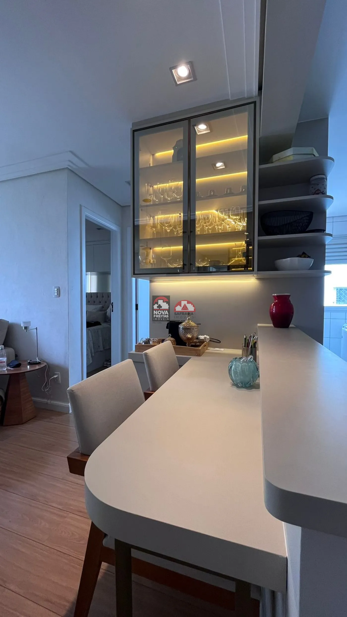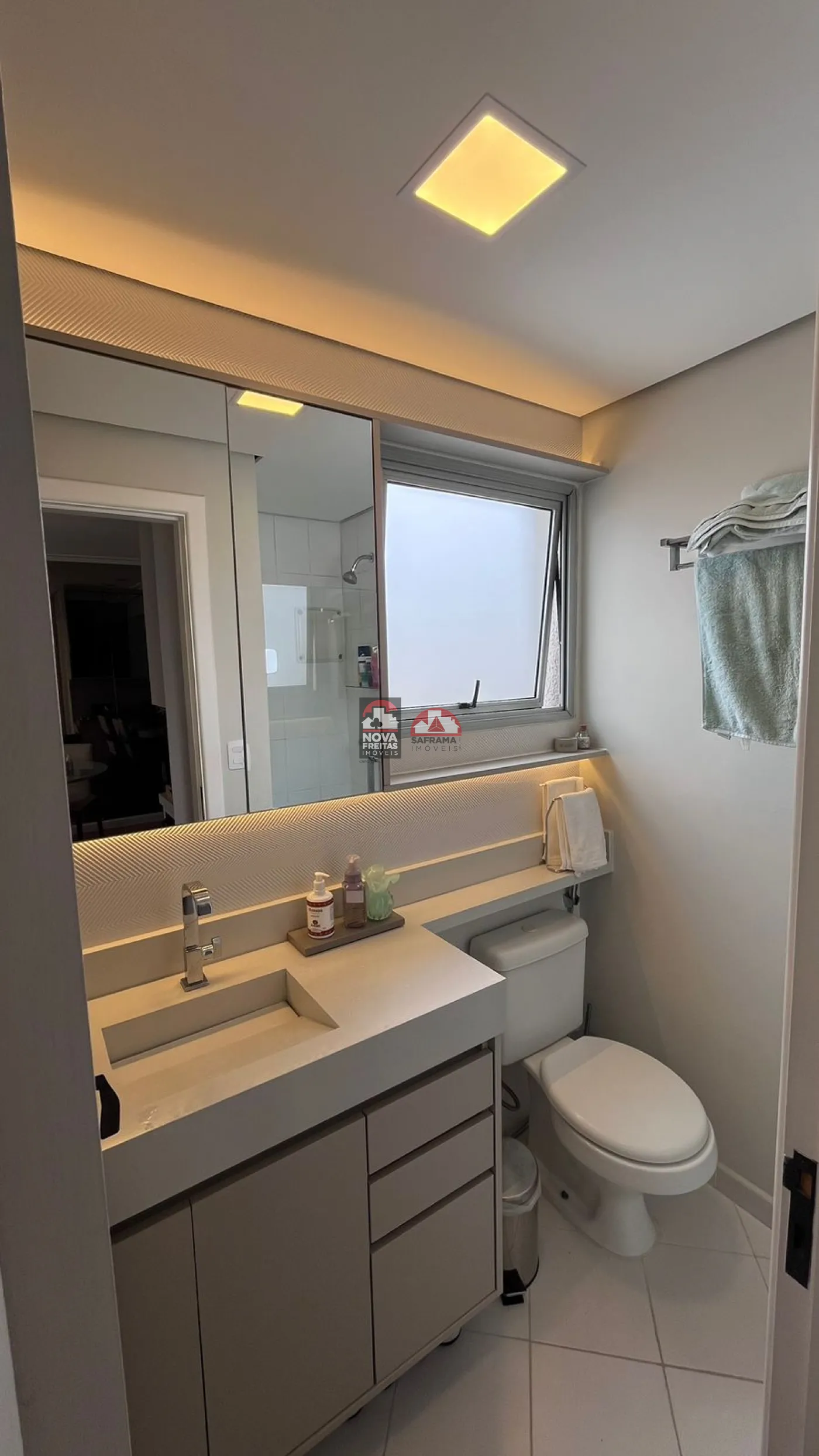 O apartamento possui ainda um banheiro moderno e bem equipado, além de uma sacada que oferece um espaço adicional para relaxar e apreciar a vista. Para a sua comodidade, são duas vagas de garagem.