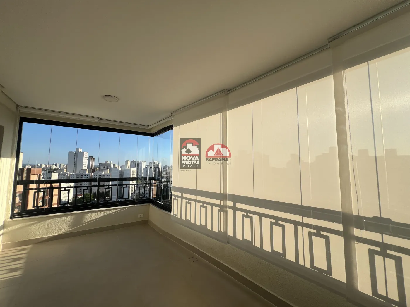 Suíte principal com varanda (porta balcão com persiana de enrolar), espaço para cama queen size e espaço de armário prolongado 4,75 m