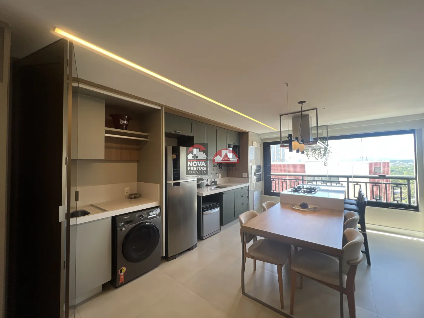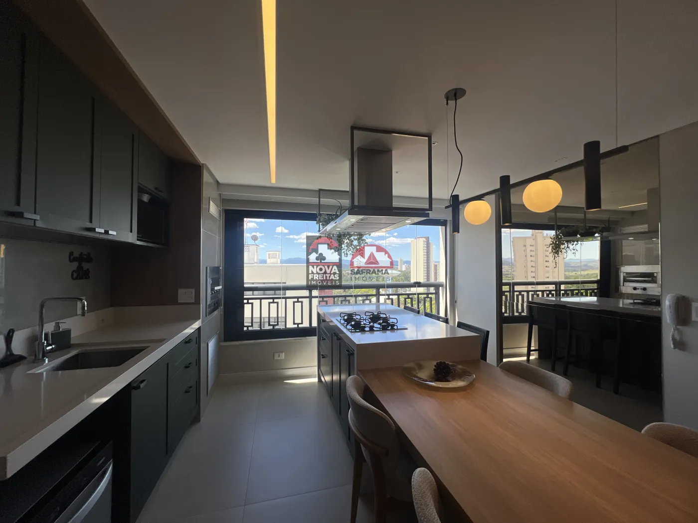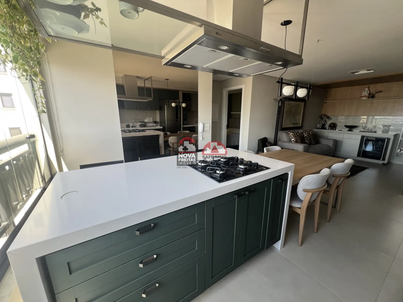 A cozinha é um show à parte, com armários em uma paleta de cores moderna (verde escuro/cinza), bancada em ilha com cooktop, coifa de design e uma mesa de jantar acoplada, perfeita para receber amigos e família. Conta também com área de serviço discreta e funcional.