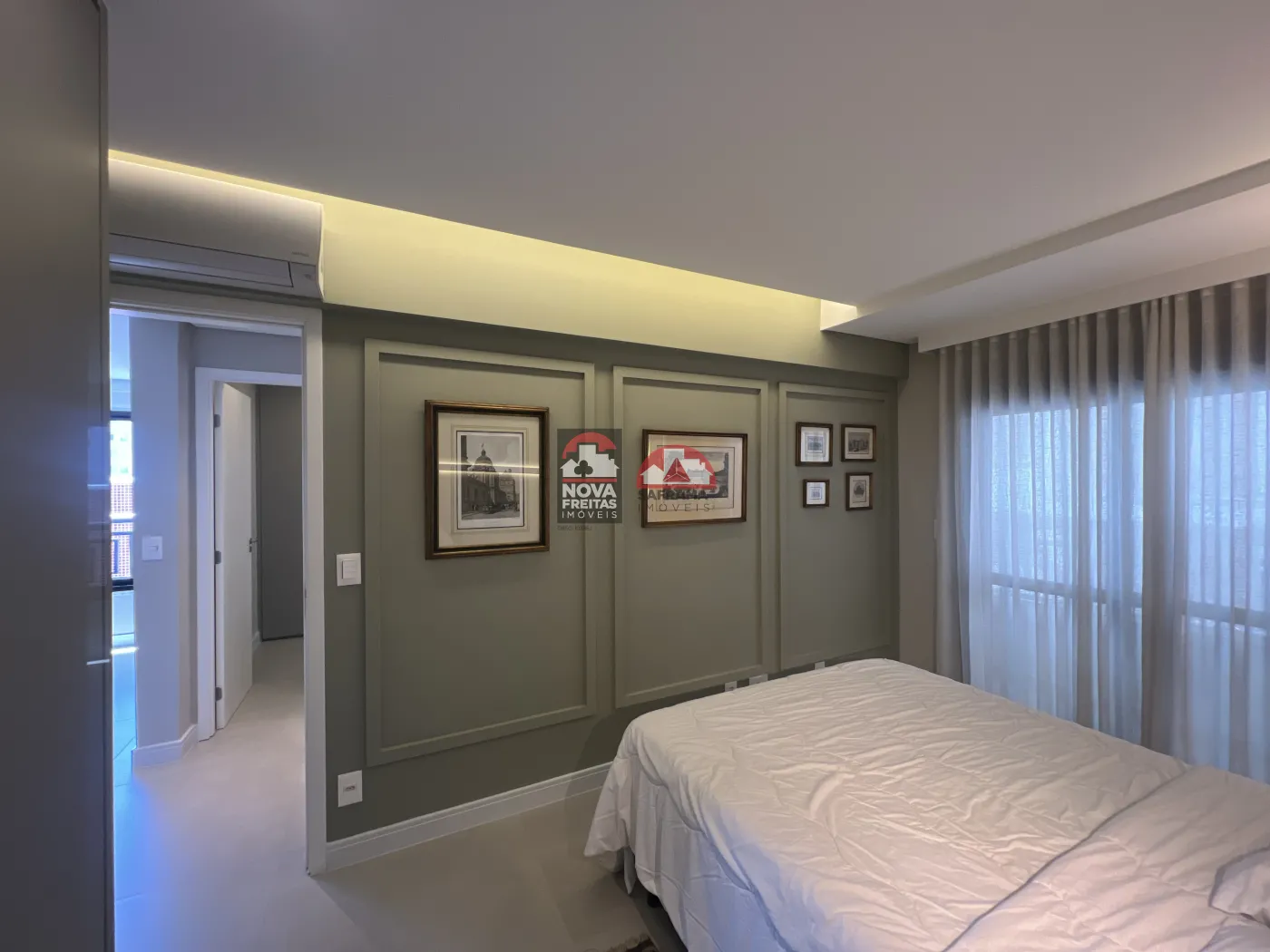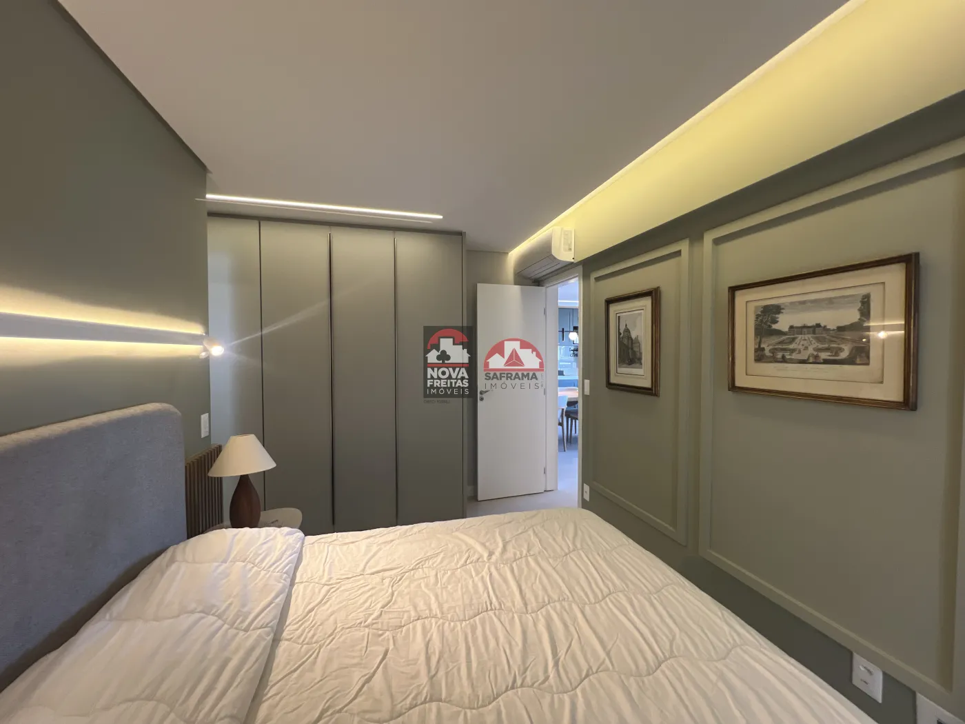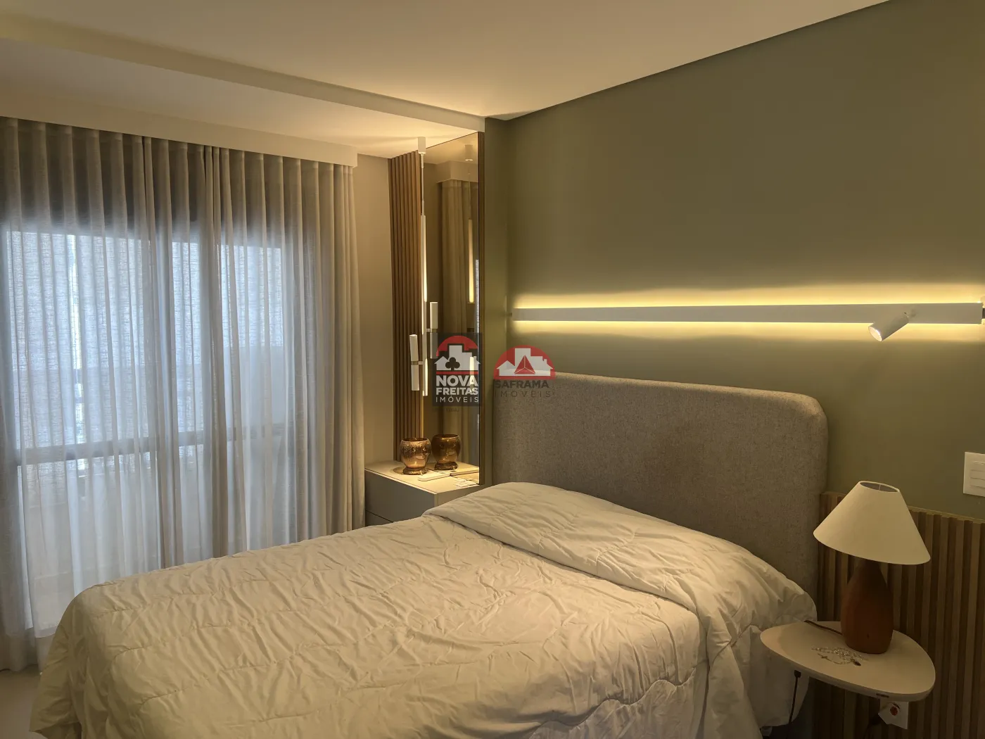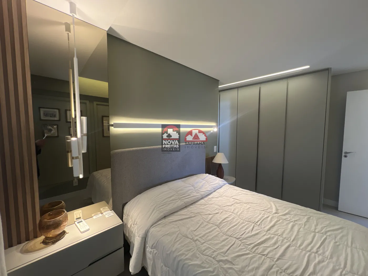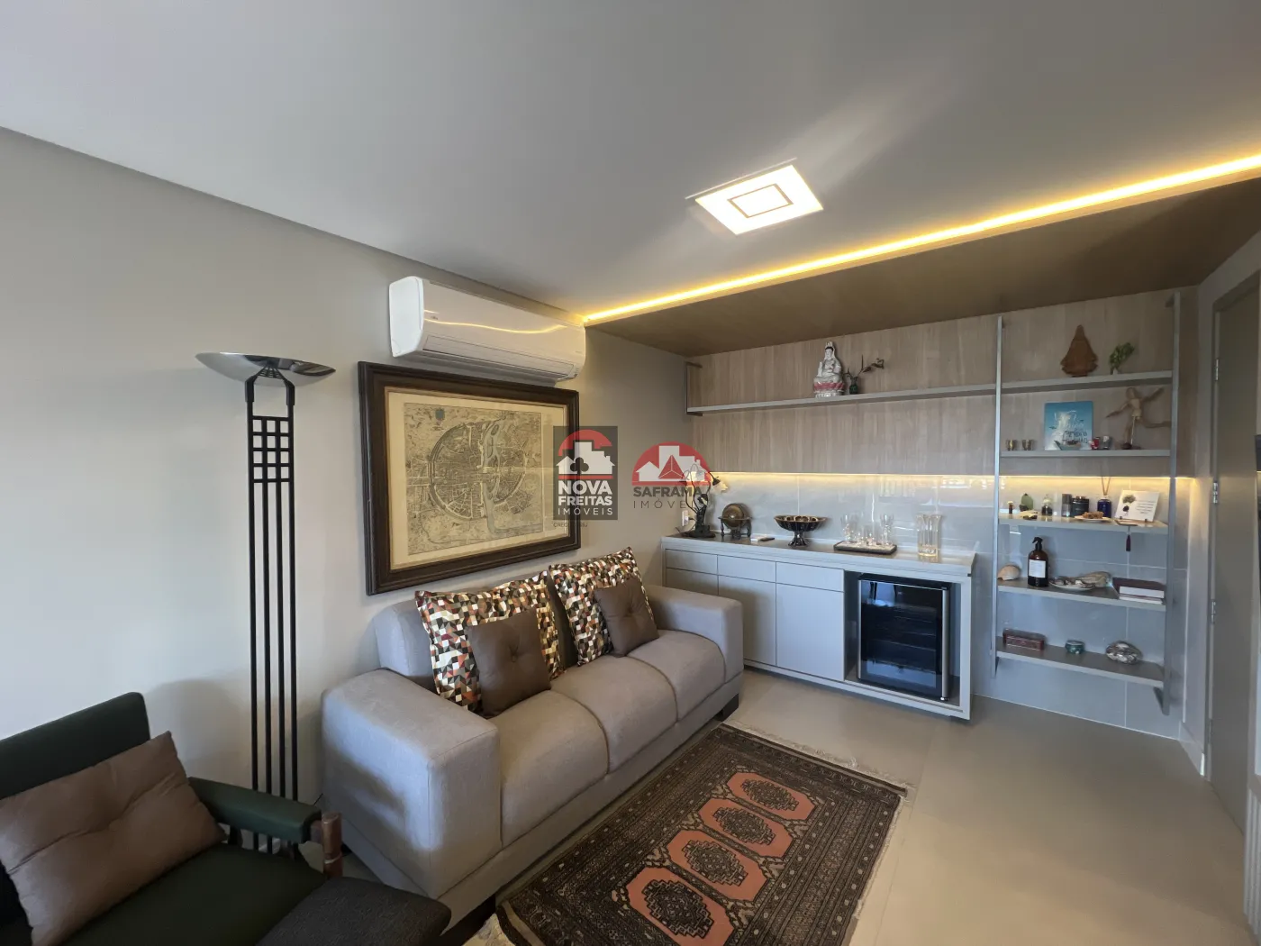O living é acolhedor, com marcenaria planejada, iluminação em LED que cria um ambiente intimista e aconchegante, e espaço para bar/adega. A suíte oferece tranquilidade, com um elegante painel de parede, iluminação de destaque e persianas que garantem privacidade.
