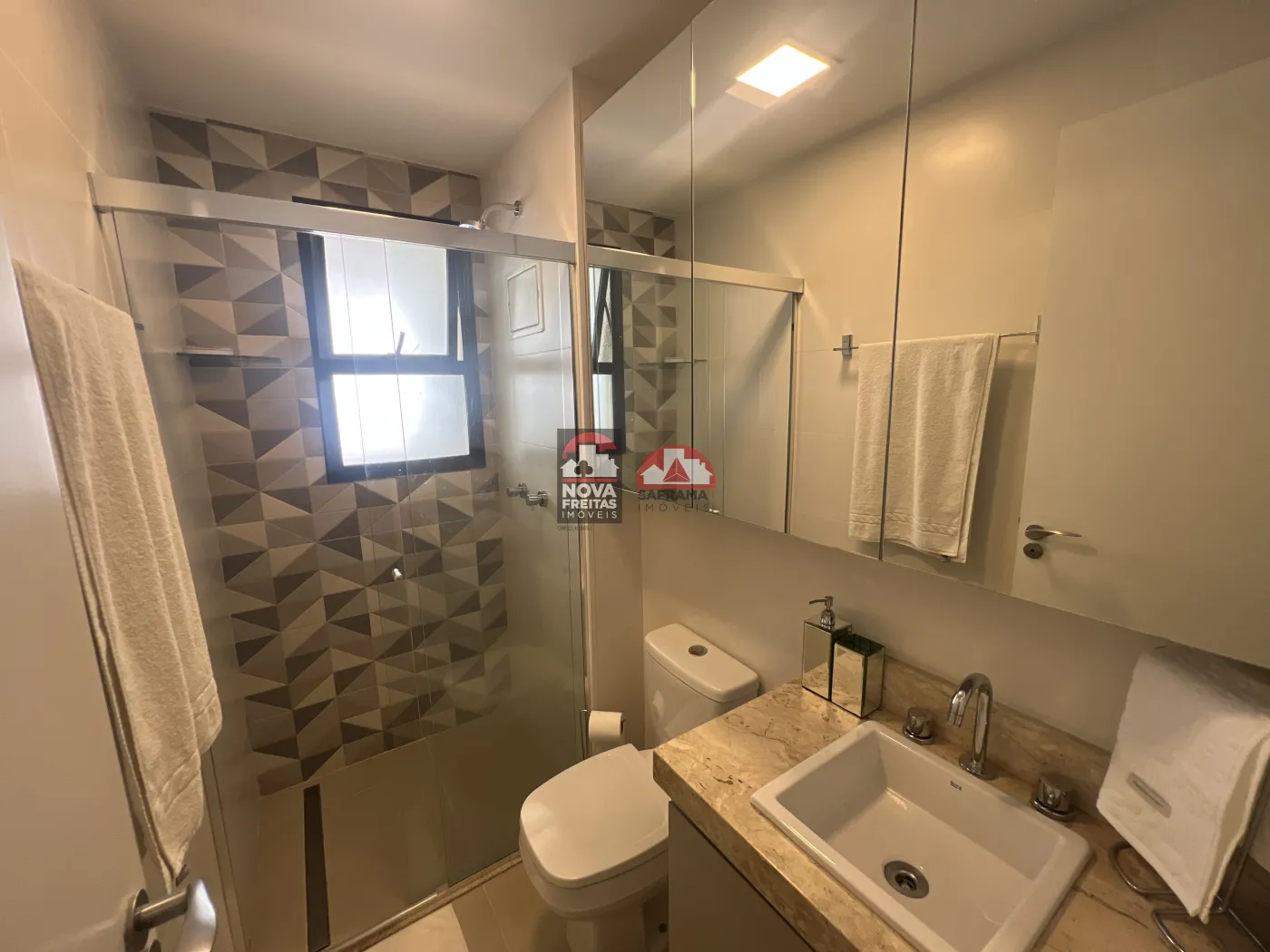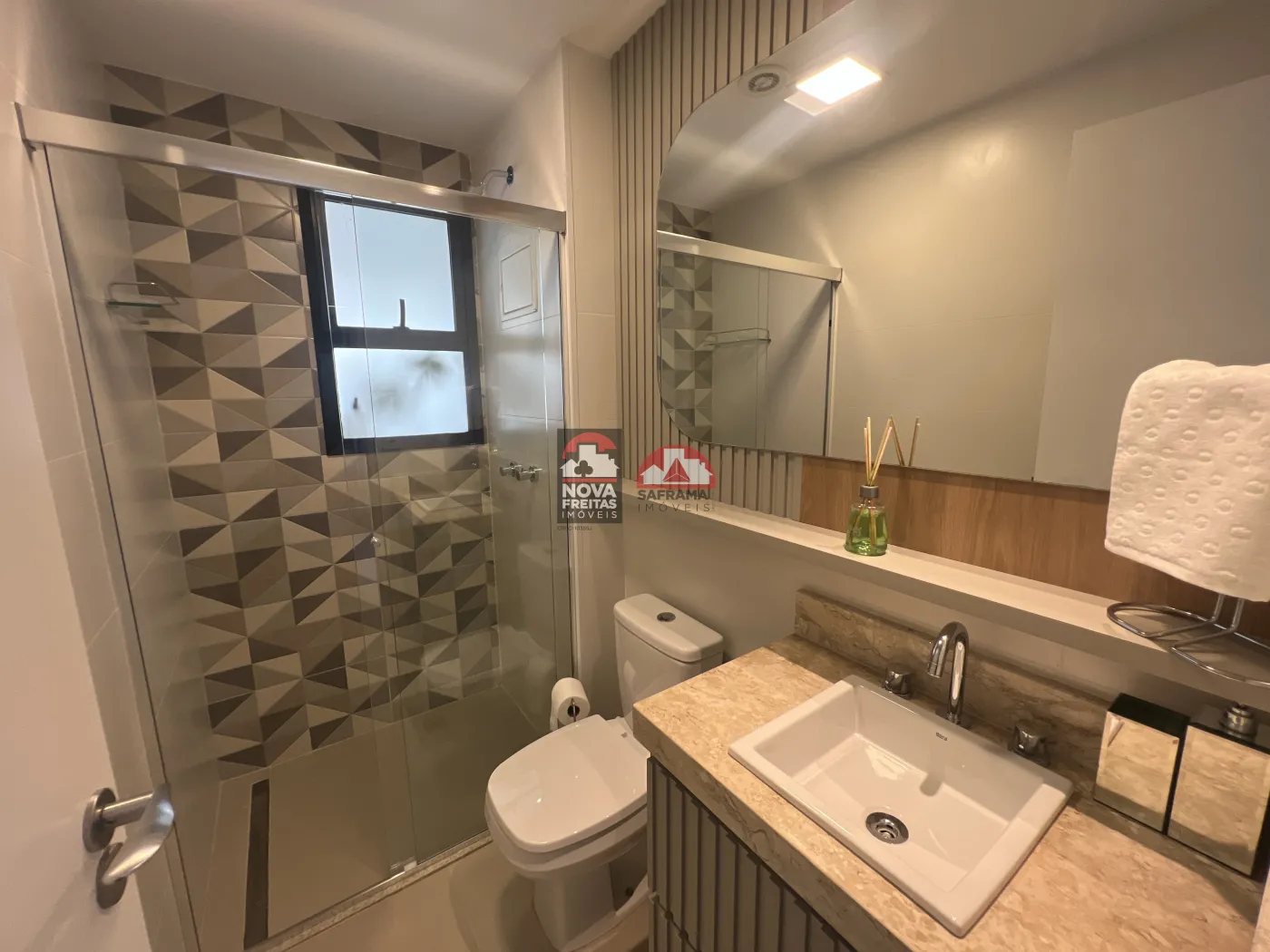 Os acabamentos são de primeira linha em todo o apartamento, incluindo banheiro com box em vidro e revestimentos modernos.