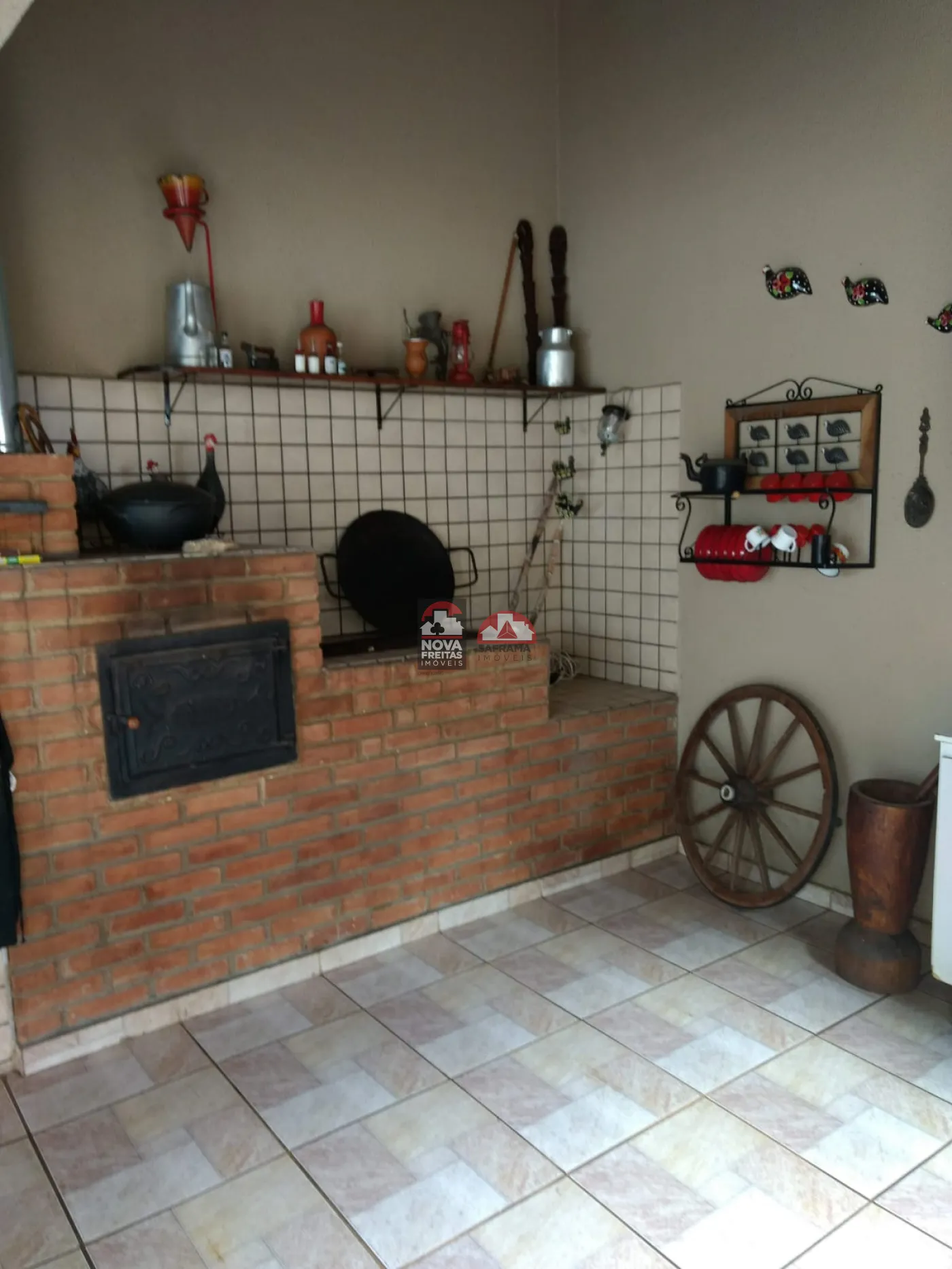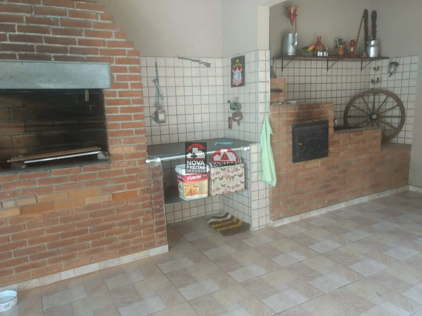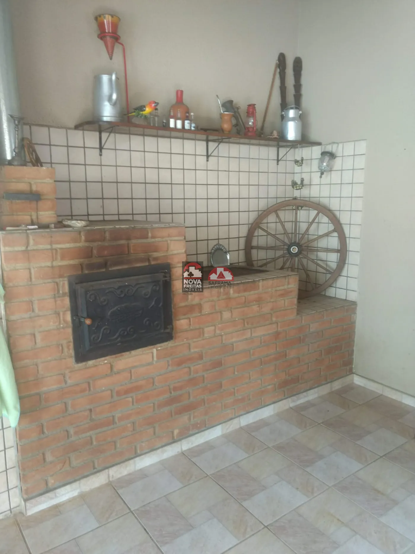 O imóvel conta com armários na cozinha e banheiros e conta ainda com piscina, churrasqueira e forno a lenha.