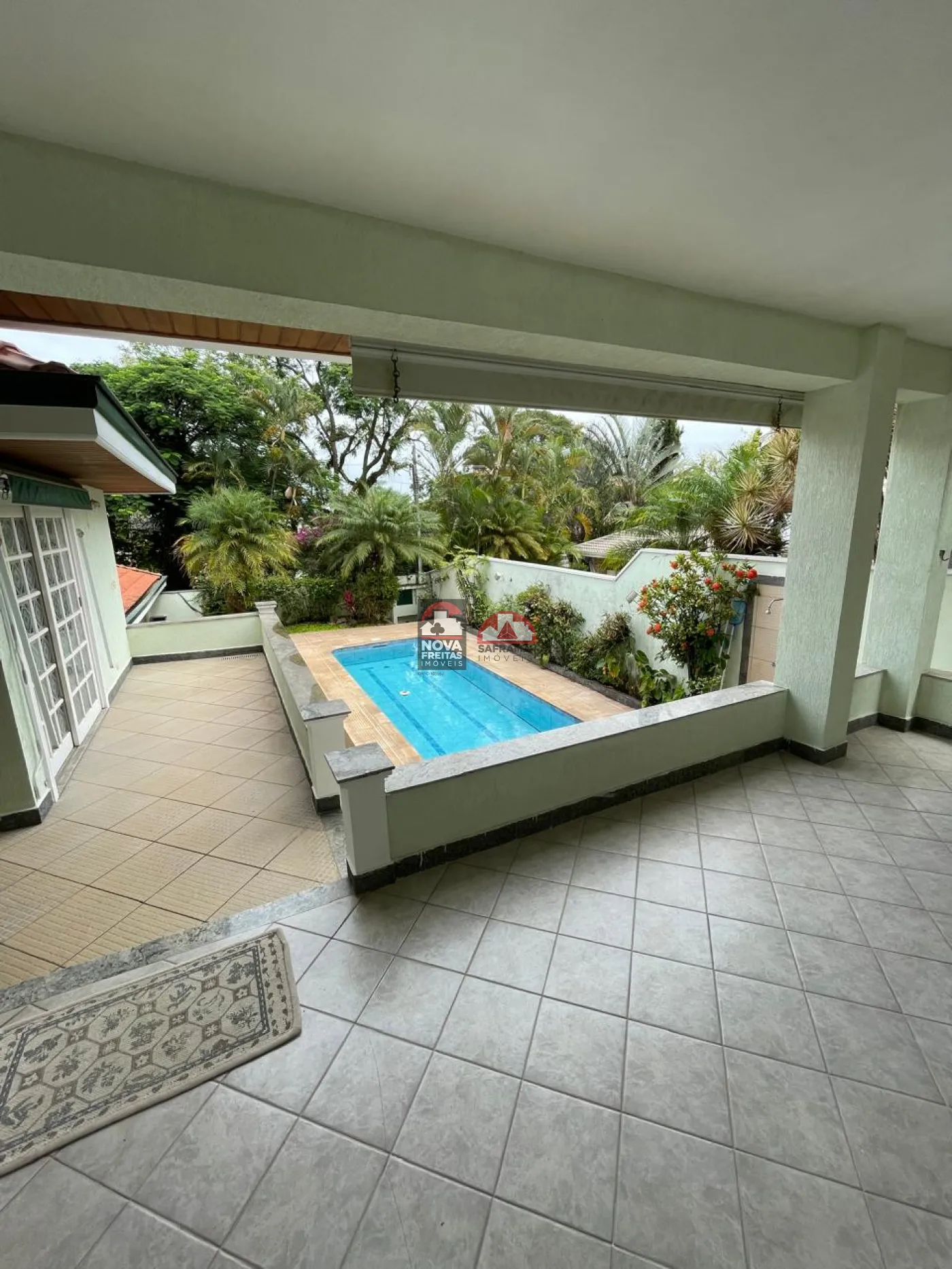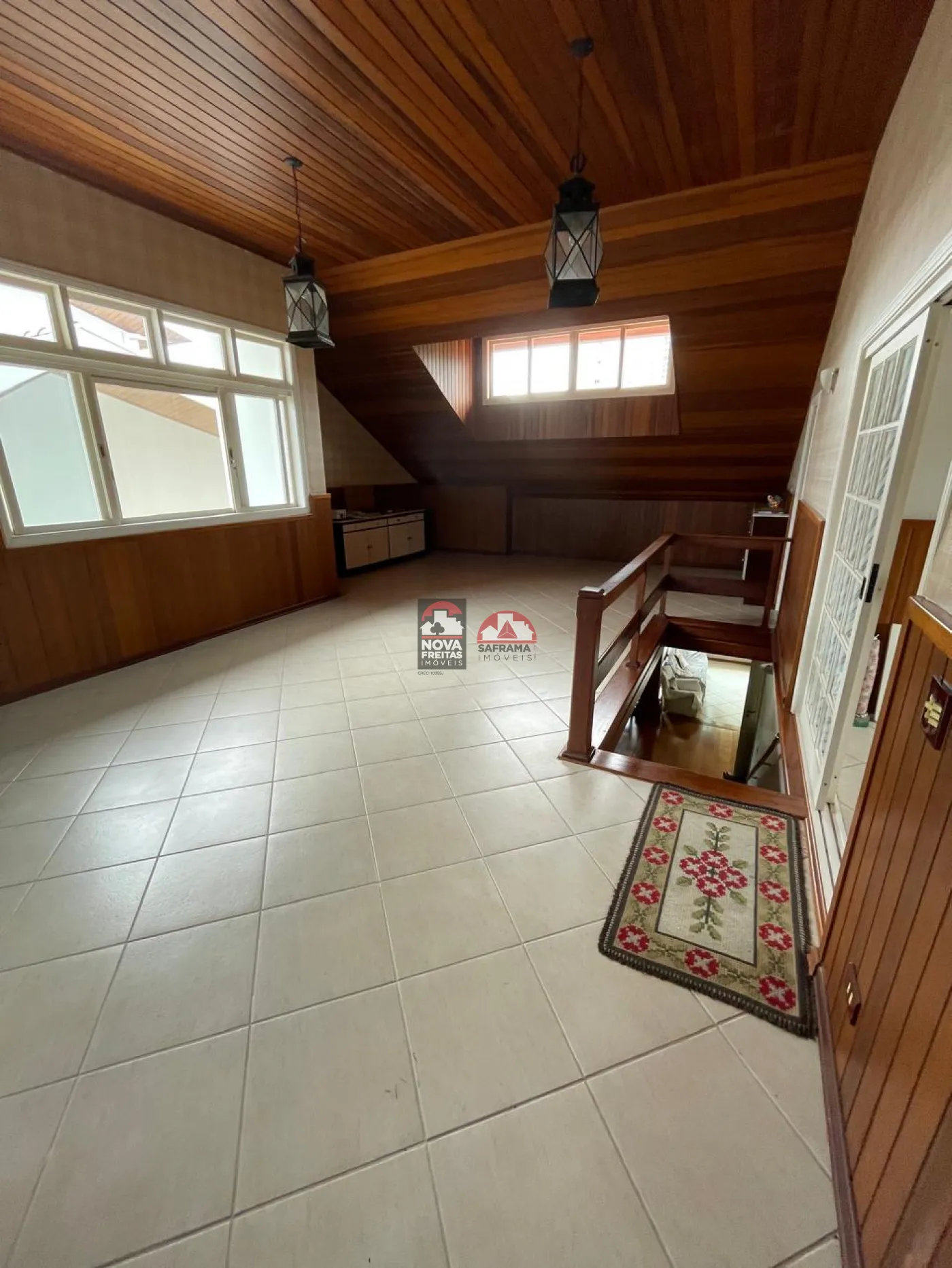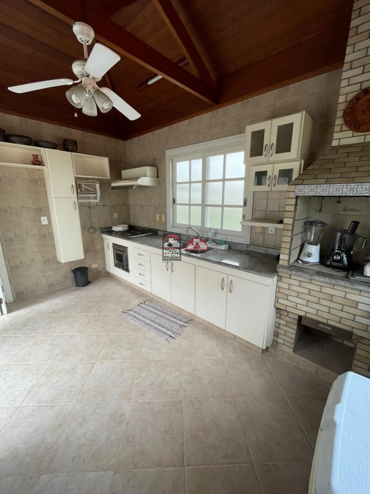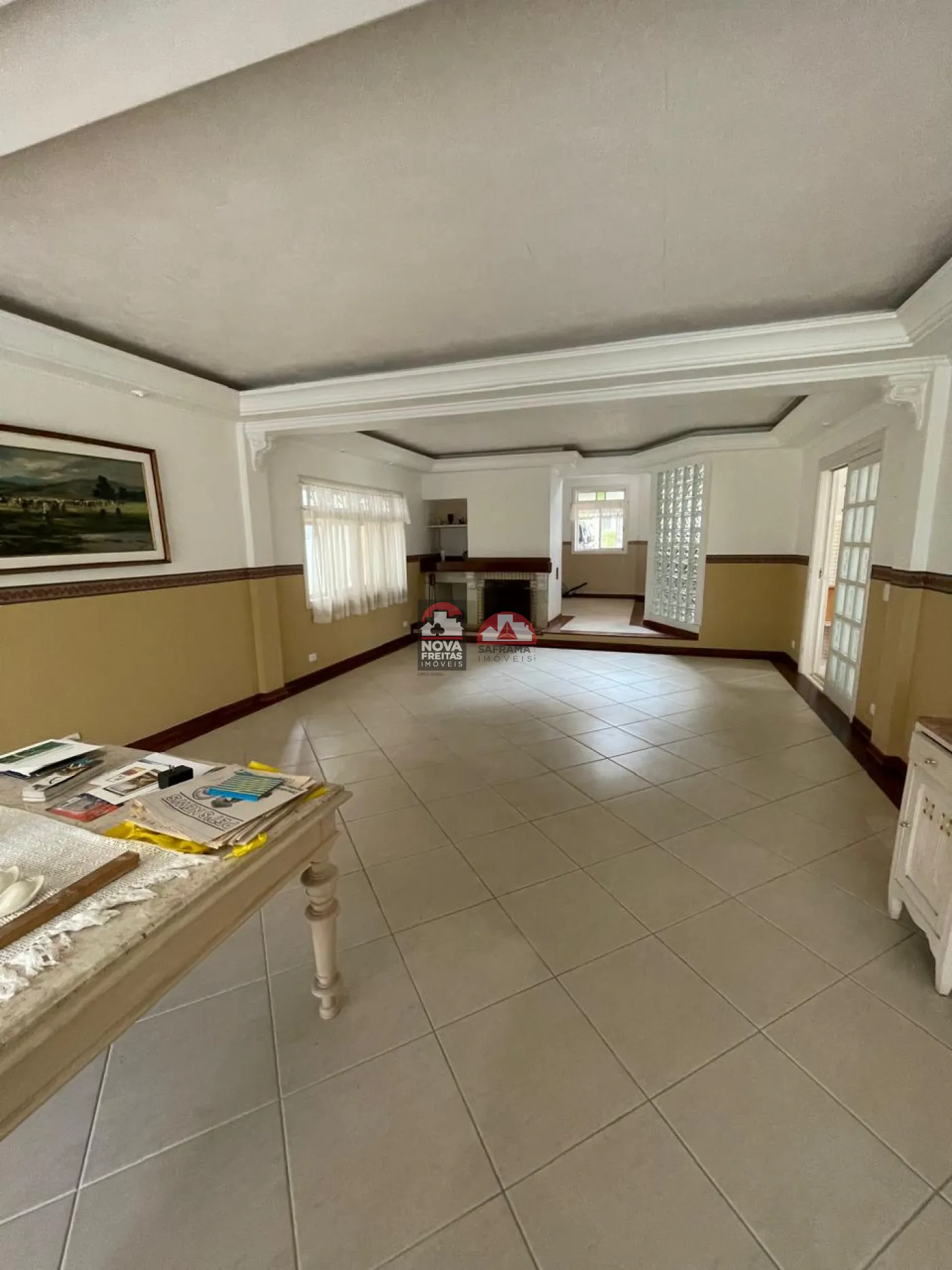 Sala social com hall de entrada (em granito), lavabo, bar completo (em mogno), lareira e os demais ambientes. Pisos em tábua corrida na área de lareira, sala de visita e sala de jantar e varanda (vide sala de TV)