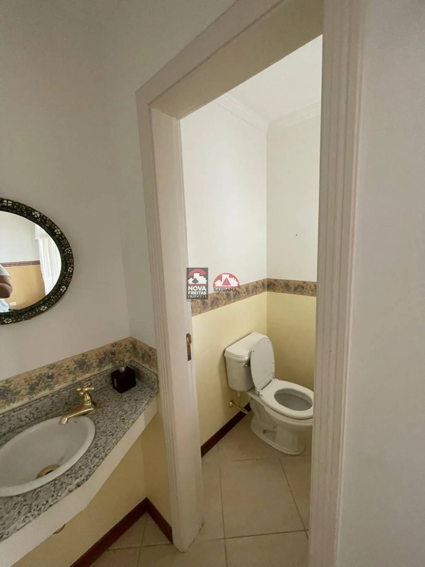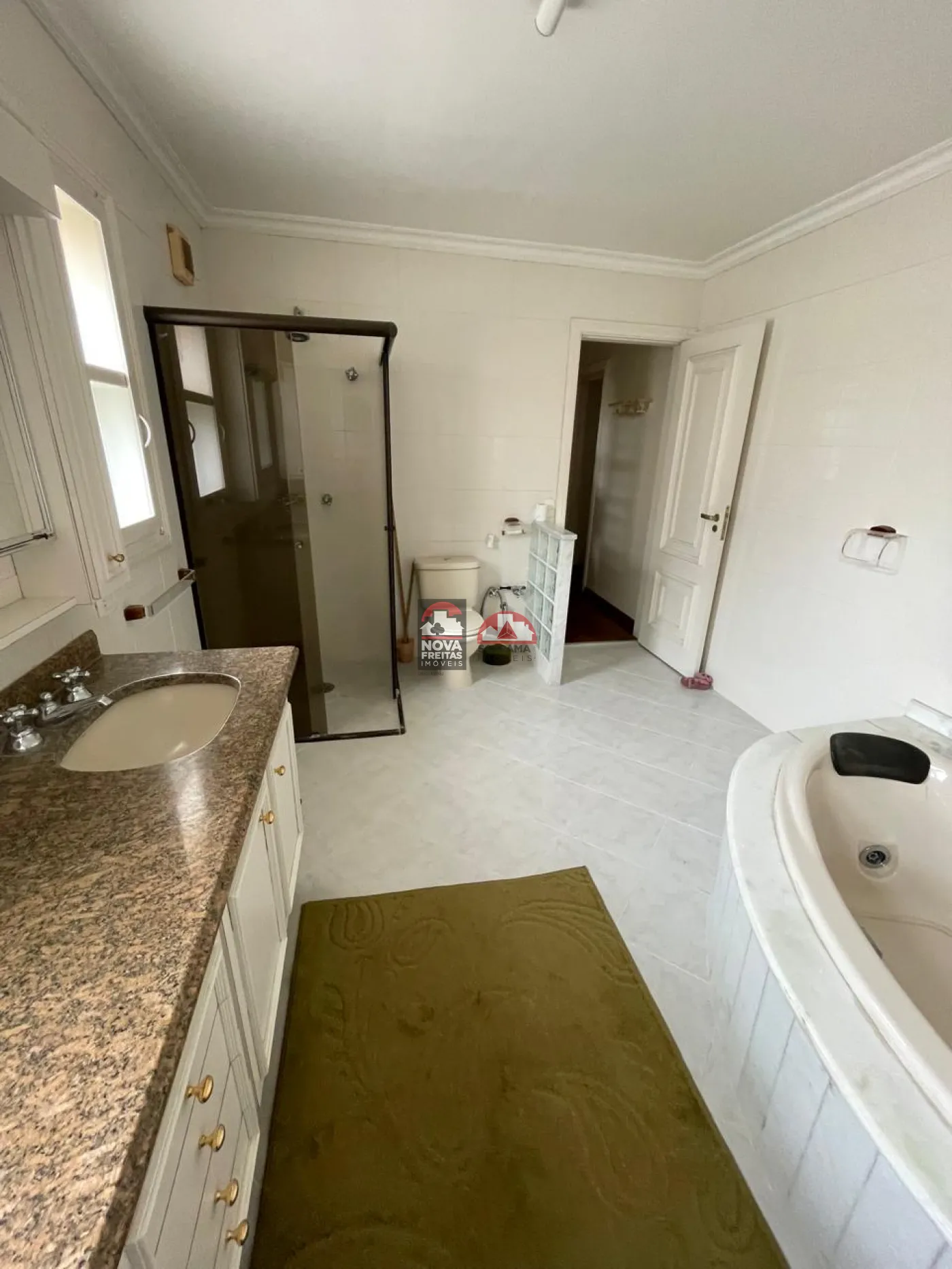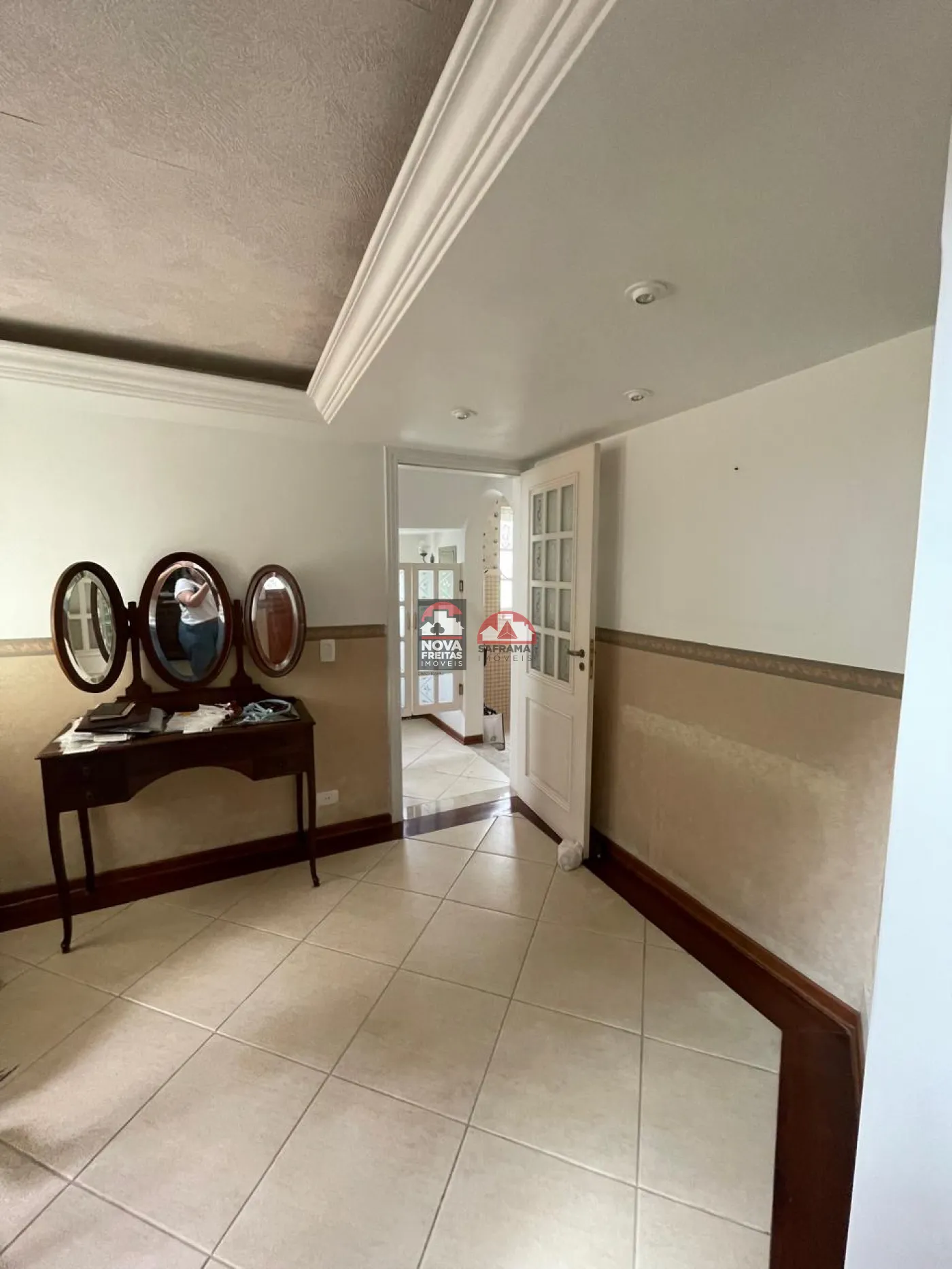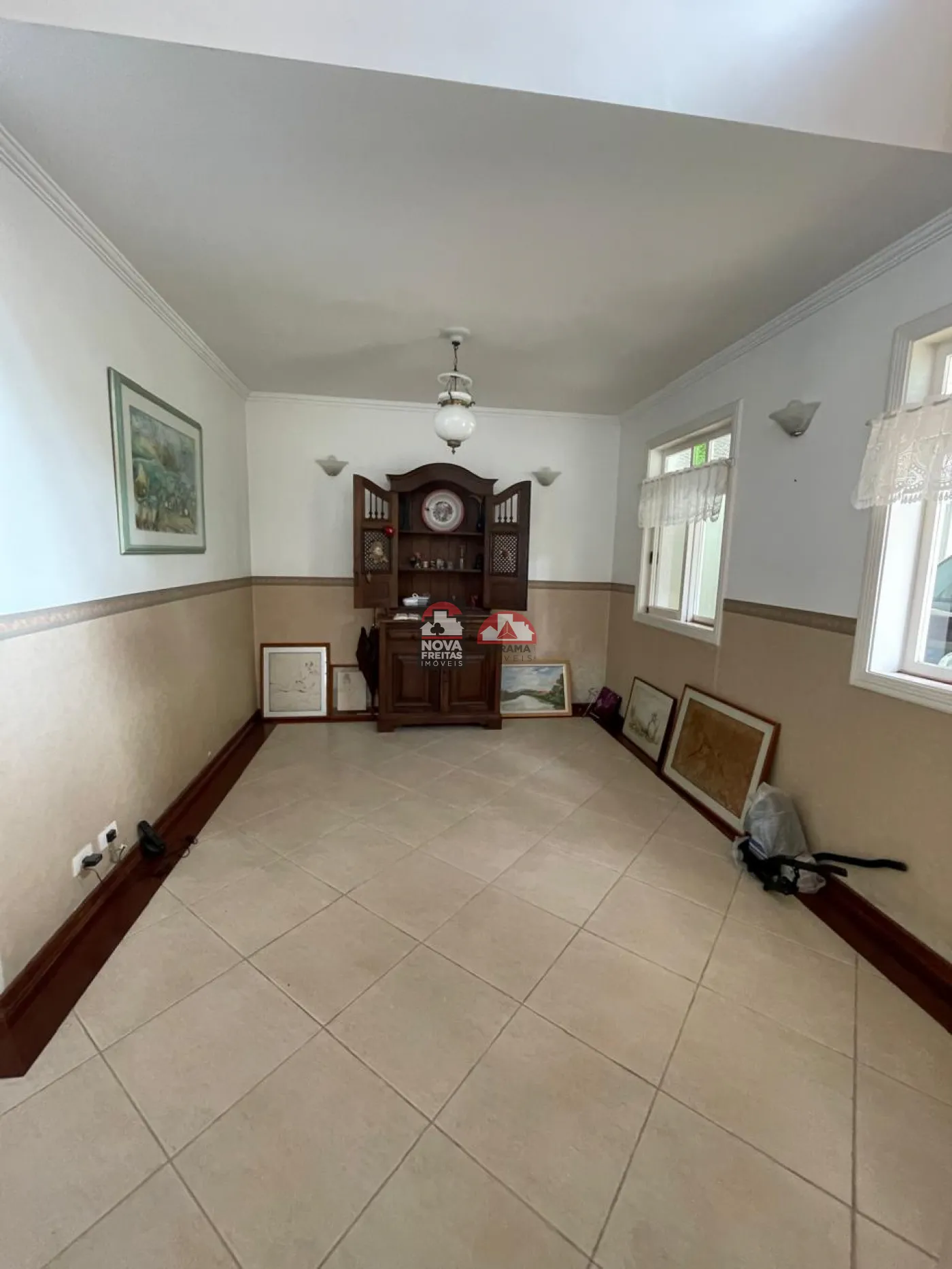 Sala social com hall de entrada (em granito), lavabo, bar completo (em mogno), lareira e os demais ambientes. Pisos em tábua corrida na área de lareira, sala de visita e sala de jantar e varanda (vide sala de TV)