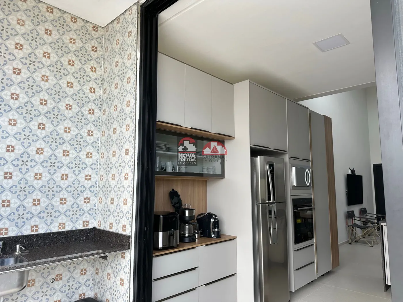 Cozinha integrada à área gourmet, com móveis planejados