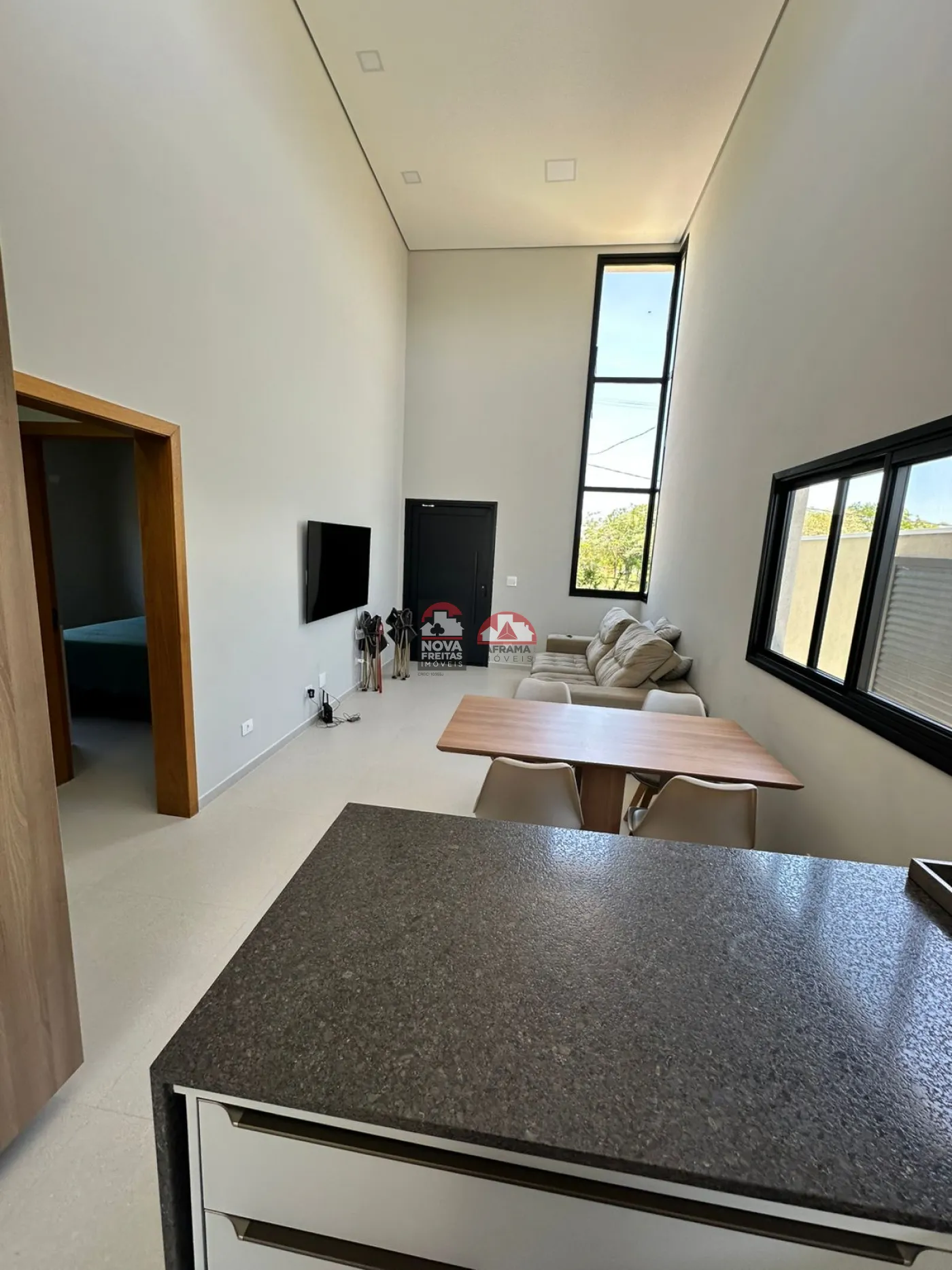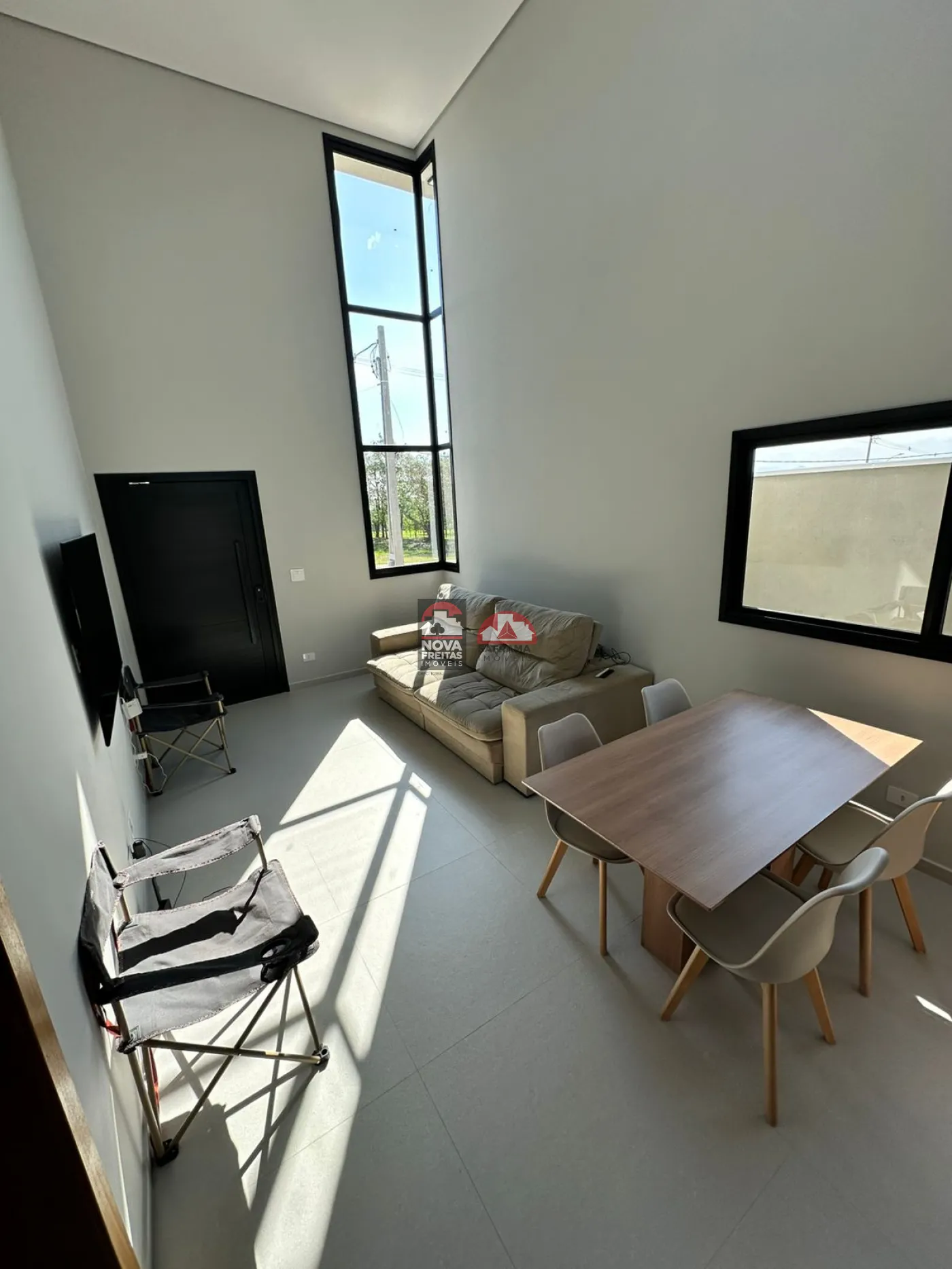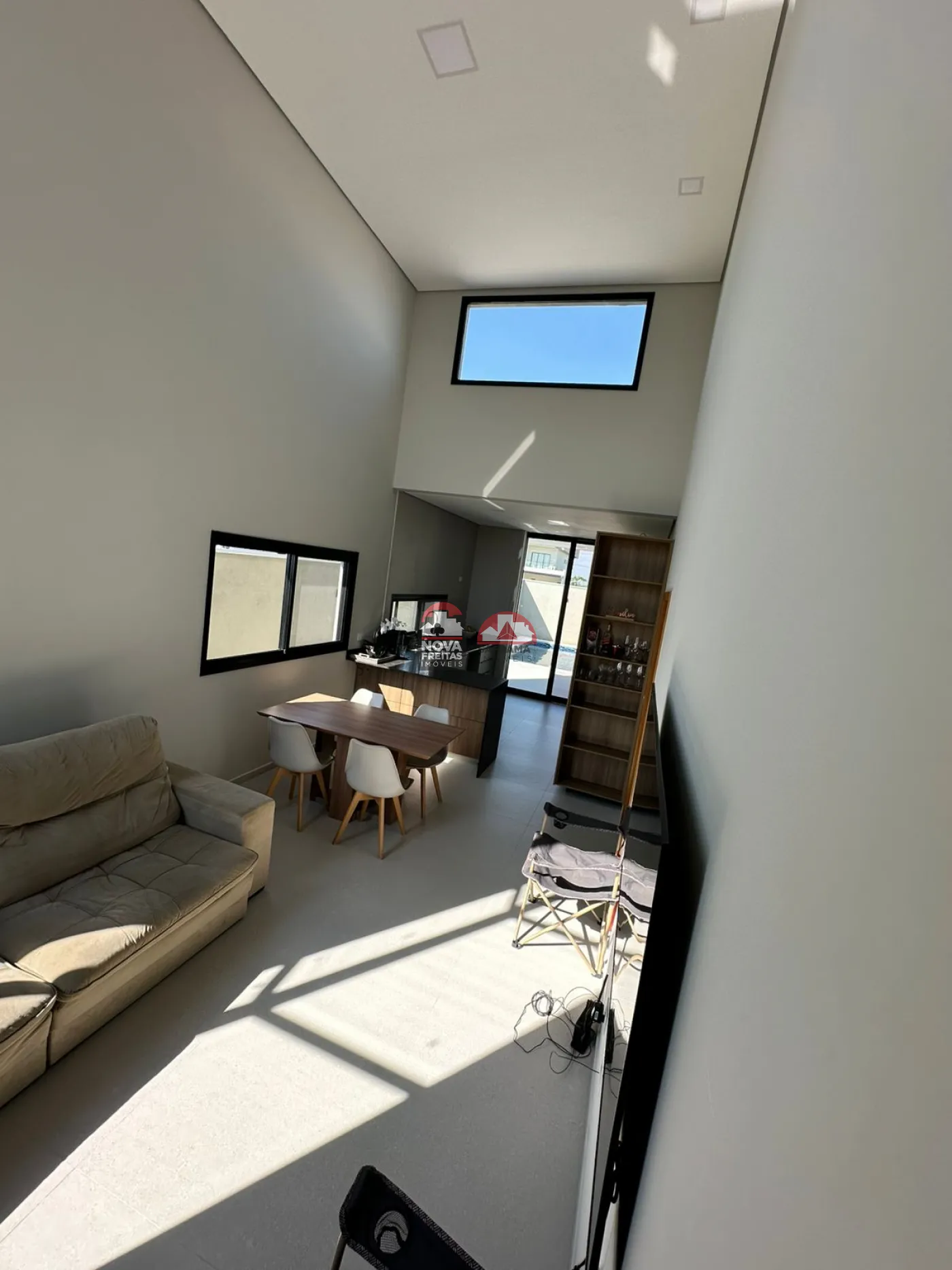 Sala ampla com pé-direito duplo, proporcionando excelente iluminação e ventilação natural