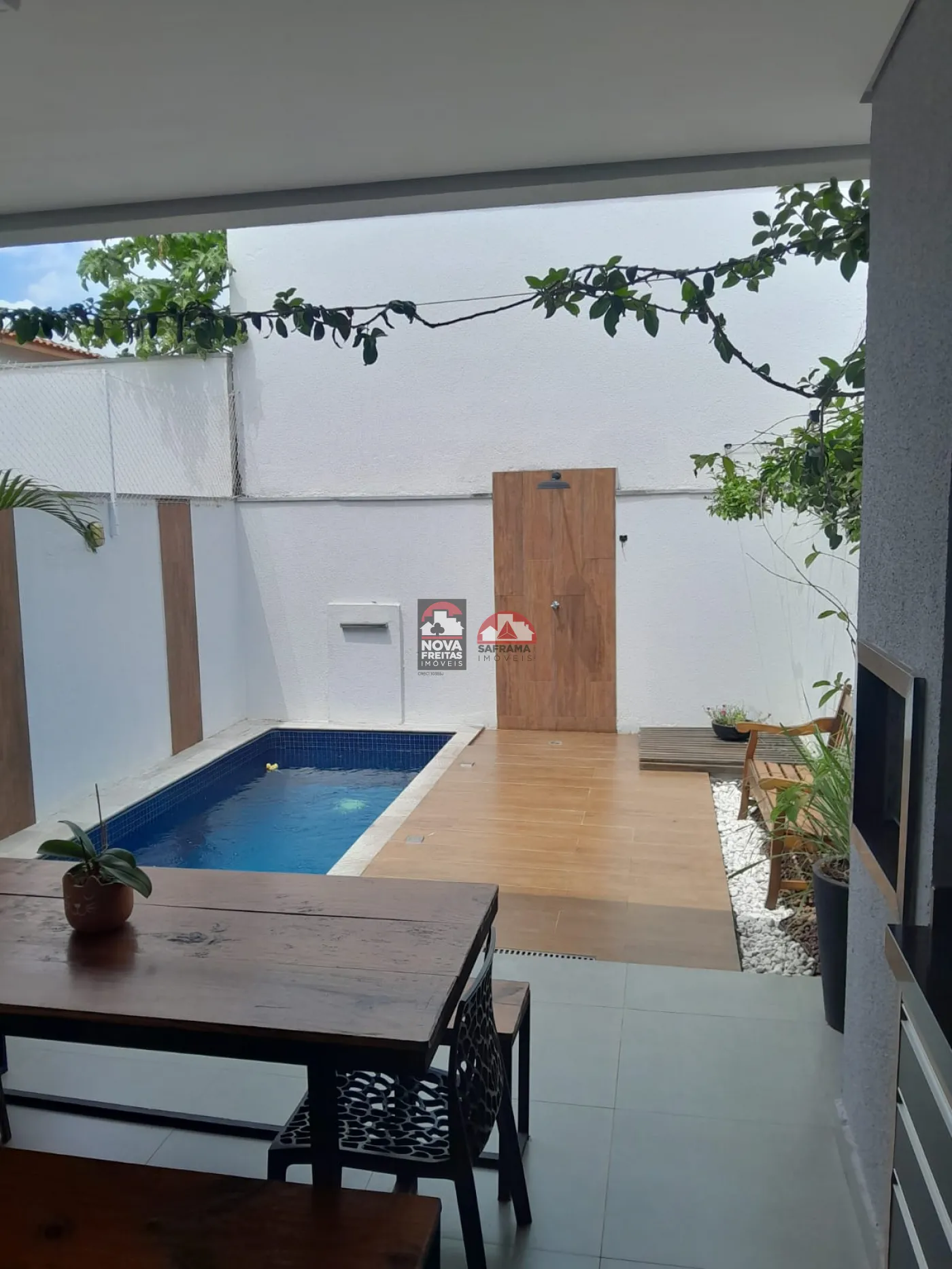 Quintal com área gourmet e piscina medindo 2 X 4 com aquecimento elétrico.